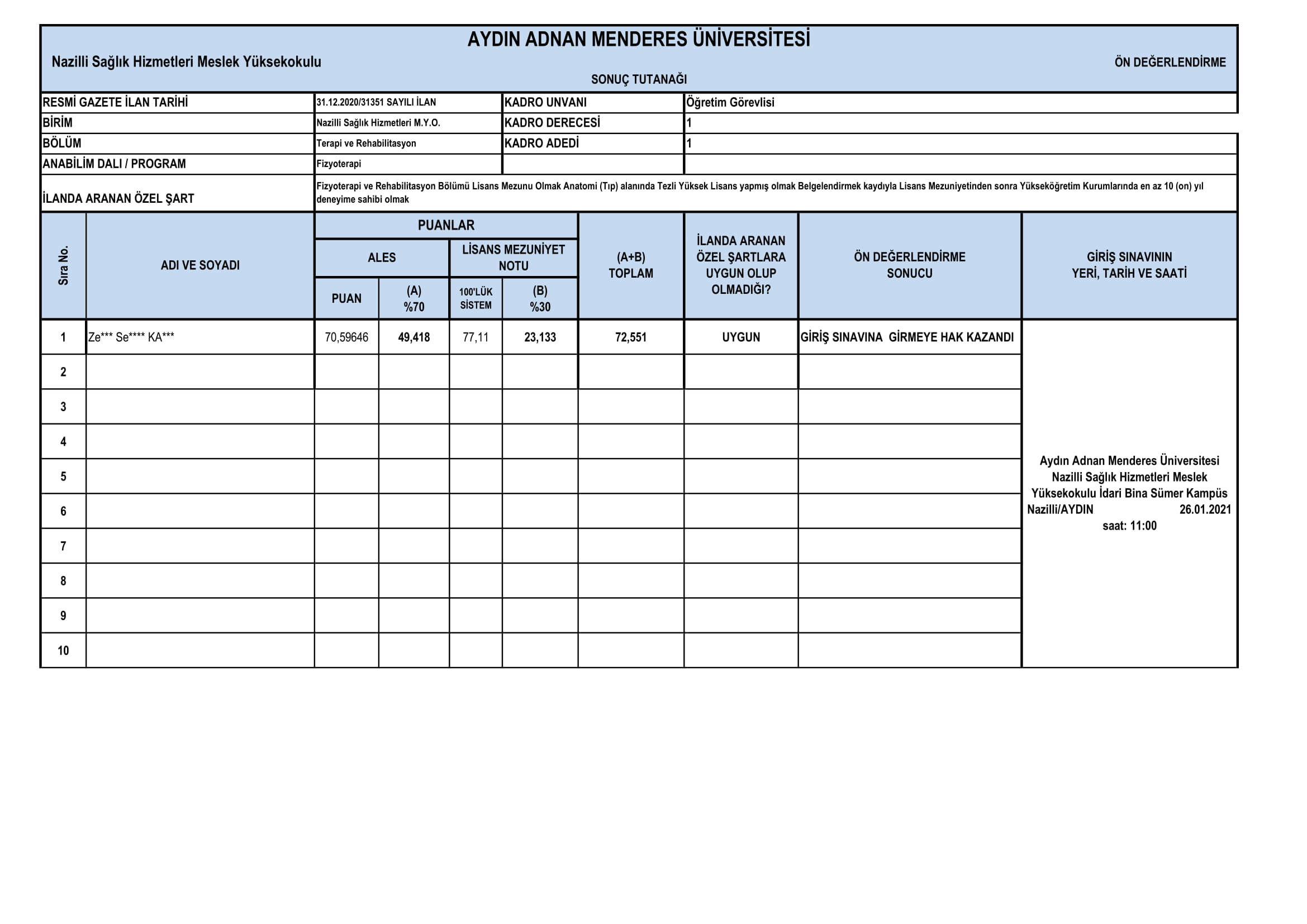 FİZYOTERAPİ PROGRAMI 1. DERECE ÖĞRETİM GÖREVLİSİ ÖN DEĞERLENDİRME SONUÇLARI