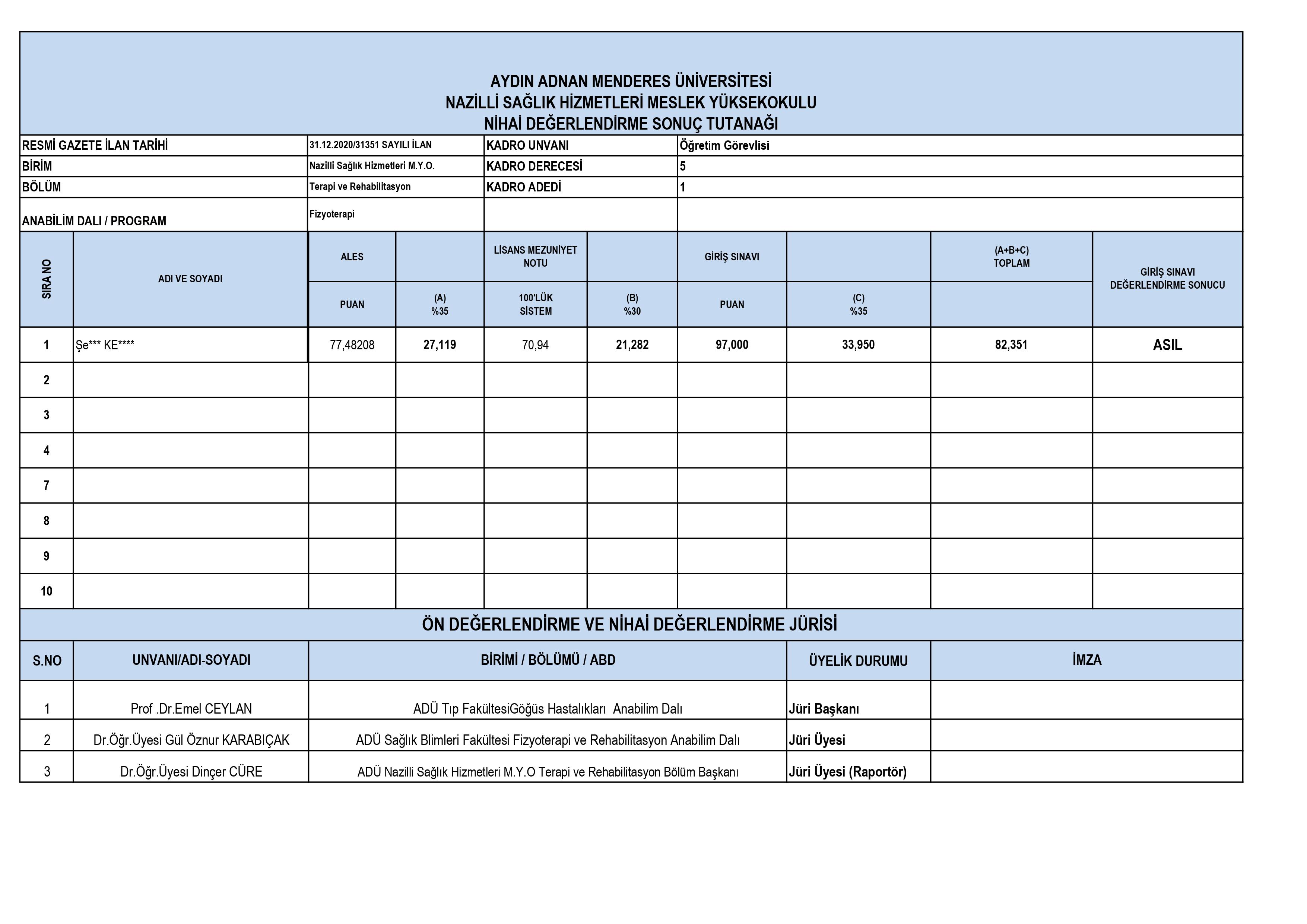 FİZYOTERAPİ PROGRAMI 5. DERECE ÖĞRETİM GÖREVLİSİ NİHAİ DEĞERLENDİRME SONUCU