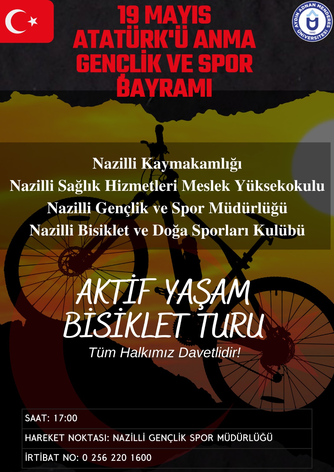 Nazilli Kaymakamlığı koordinatörlüÄŸünde Nazilli SaÄŸlık Hizmetleri Meslek Yüksekokulunun önerisi ile 19 Mayıs Atatürk’ü Anma, Gençlik ve Spor Bayramı programına alınan Aktif YaÅŸam Bisiklet turu etkinliÄŸi Nazilli SaÄŸlık Hizmetleri Meslek Yüksekokulu ÖÄŸretim Elemanları, Sümer Kampüsünde eÄŸitim alan üniversite öÄŸrencileri, Nazilli Bisiklet ve DoÄŸa Sporları Kulübü üyelerinin ve halkın yoÄŸun katılımı ile gerçekleÅŸti. EtkinliÄŸin gerçekleÅŸtirilmesinde Nazilli İlçe Gençlik ve Spor MüdürlüÄŸü, Nazilli Kızılay Åžubesi, Nazilli İlçe Jandarma Komutanlığı ve Nazilli İlçe Emniyet MüdürlüÄŸü de destek verdi.