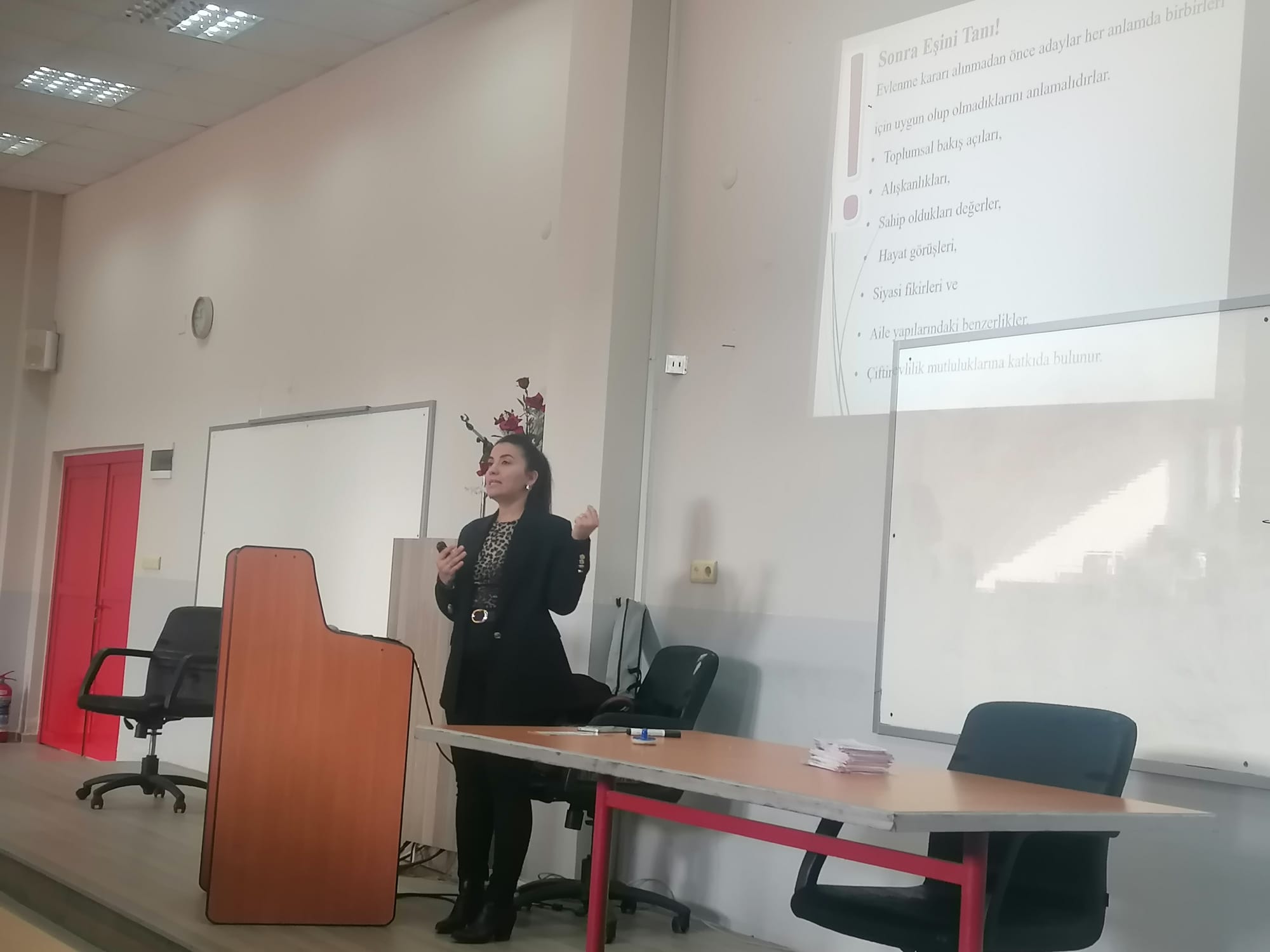 Seminerde, evlilik öncesinde saÄŸlıklı iletiÅŸim kurmanın önemi, çiftlerin birbirlerini tanıma süreçlerinde dikkat edilmesi gereken noktalar ve iliÅŸkiyi güçlendiren iletiÅŸim becerileri ele alındı. Ayrıca aile içi iletiÅŸimde karşılaşılan sorunlar, bu sorunların nasıl çözülebileceÄŸi ve saÄŸlıklı bir aile yapısını destekleyen tutum ve davranışlar üzerinde duruldu. ÖÄŸrencilerin hem mesleki yaÅŸamlarında hem de kiÅŸisel hayatlarında kullanabilecekleri iletiÅŸim becerileri hakkında farkındalık kazanmaları amaçlandı.