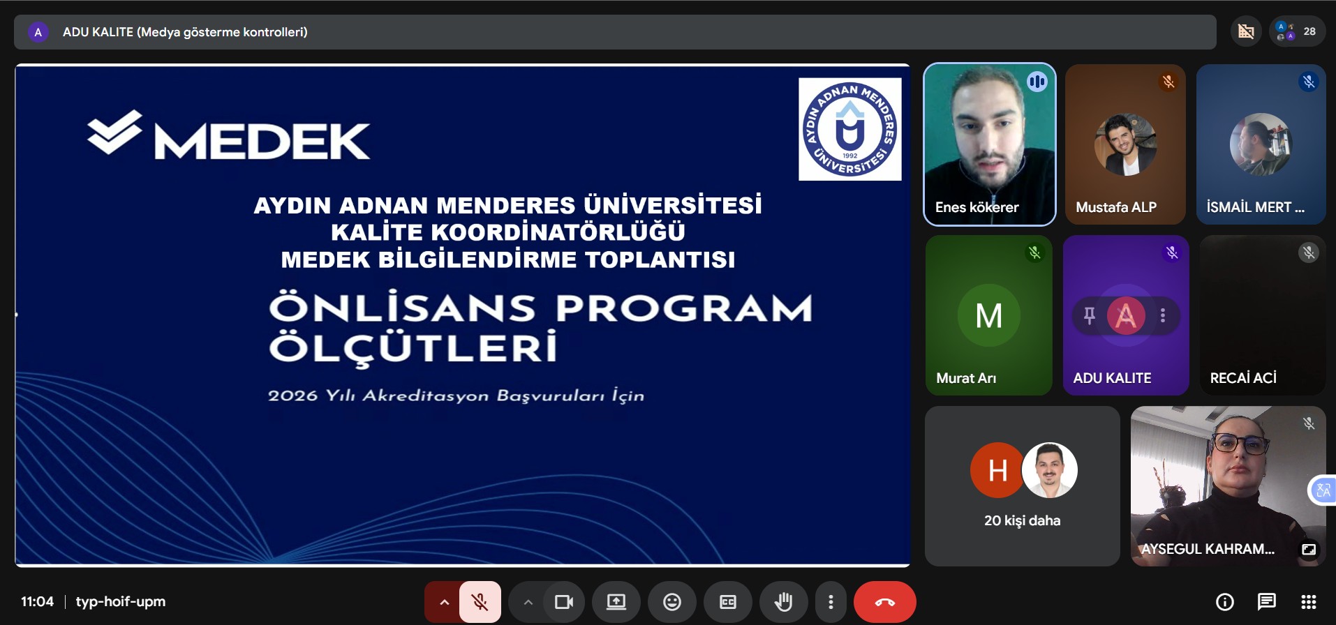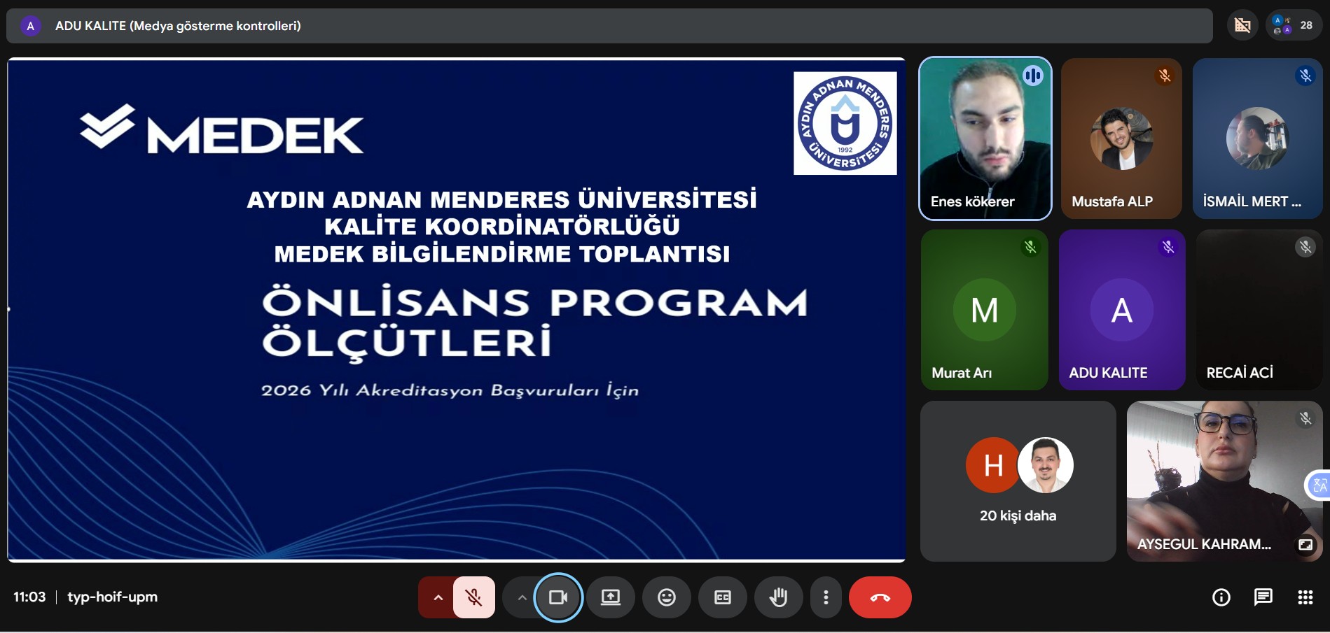 Üniversitemiz bünyesinde MEDEK (Mesleki Eğitim Değerlendirme ve Akreditasyon Derneği)’ne ön başvuruda bulunan birimlerin akreditasyon sürecine ilişkin bilgilendirilmesi ve mevcut durumlarının değerlendirilmesi amacıyla, Üniversitemiz Kalite Koordinatörlüğü tarafından 9 Şubat 2026 Pazartesi günü çevrim içi bir toplantı gerçekleştirildi.