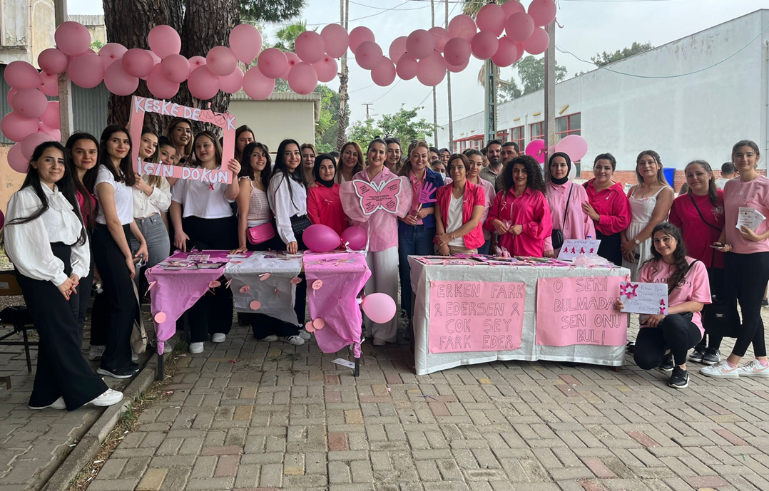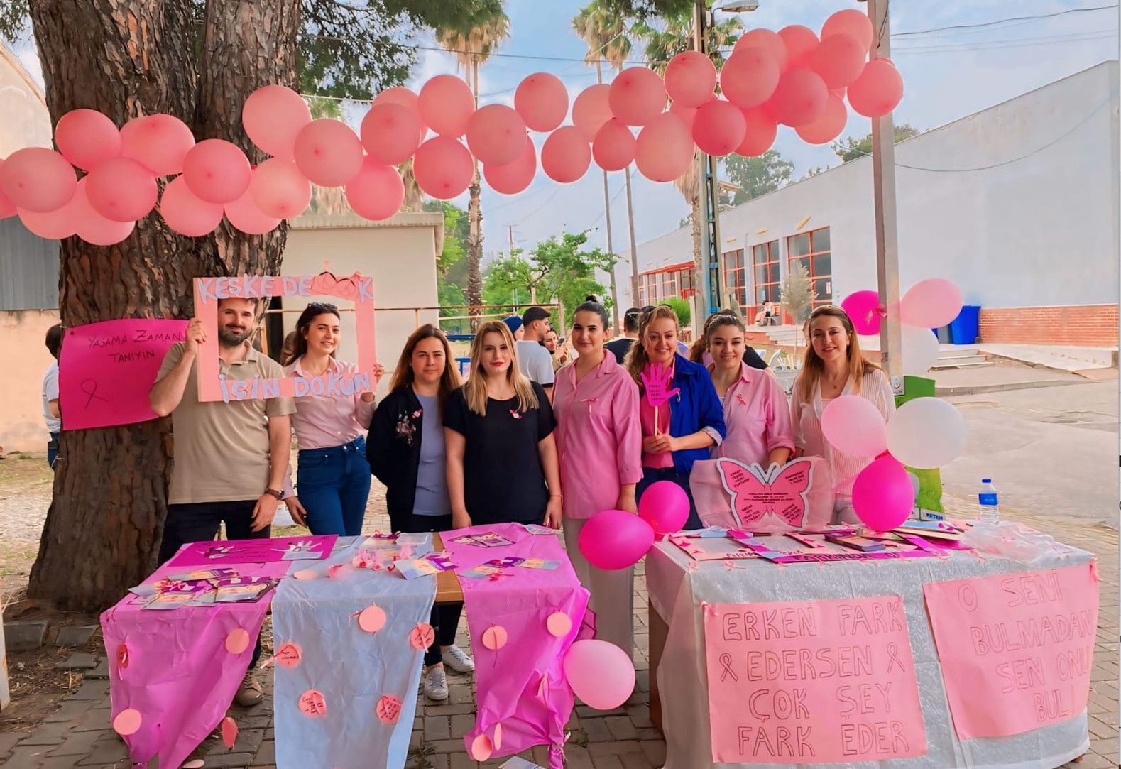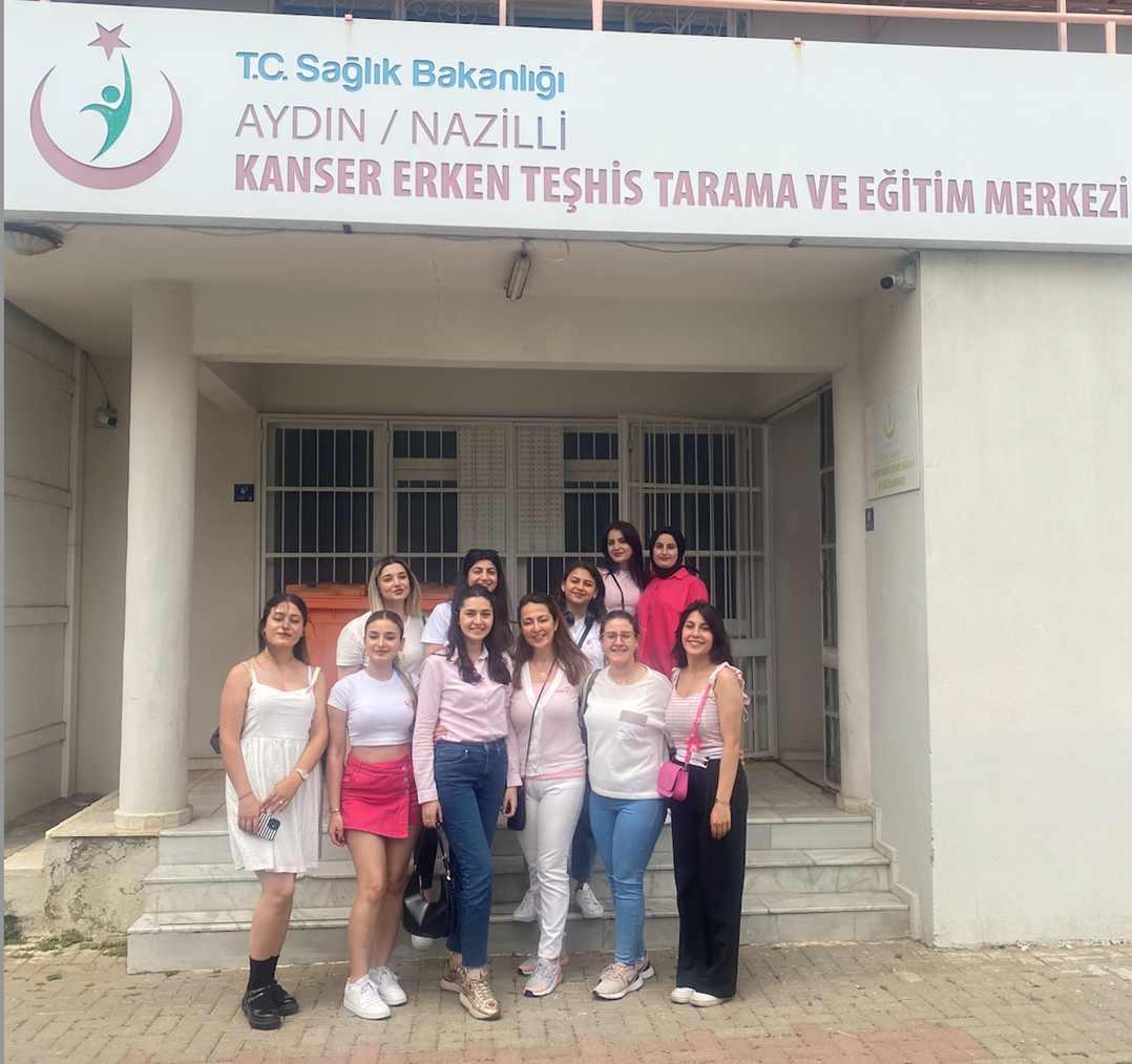 25.04.2024 tarihinde Nazilli SaÄŸlık Hizmetleri Meslek Yüksekokulunda Meme Kanseri Farkındalık etkinliÄŸi düzenlendi. EtkinliÄŸe İlçe SaÄŸlık MüdürlüÄŸünden Dr. Kübra TaÅŸkınsakarya, Ebe Bahar Fidan, SaÄŸlık Memuru Cemalettin BozoÄŸlan ve Nazillli SHMYO idari, akademik personel ve öÄŸrencileri katılım saÄŸladı. Etkinlikte meme kanseri farkındalığı konusunda eÄŸitim veren Dr. Kübra TaÅŸkınsakarya meme kanserinin tüm dünyada kadınlar arasında en sık görülen kanser türü olduÄŸunu ve meme kanserinden korunmada erken teÅŸhisin çok önemli olduÄŸunu vurguladı. Dr. TaÅŸkınsakarya, Nazilli SHMYO idari, akademik personel ve öÄŸrencilere her ay düzenli olarak yapılması gereken kendi kendine Meme Muayenesini detaylı olarak anlattı. Ardından klinik meme muayenesi için gönüllü olan öÄŸrencilerimize KETEM’de meme muayenesi yapıldı. YoÄŸun ilginin gösterildiÄŸi etkinlikte öÄŸrencilerimiz Sümer kampüsünde stand açıp, pembe balonlar, kurdeleler, broÅŸürler dağıttı. Etkinlikte tüm öÄŸrenciler pembe giyinerek farkındalık oluÅŸturdu. Destekleri için İlçe SaÄŸlık Müdürü Dr. Åžule AkbaÅŸ’a teÅŸekkür ederiz.