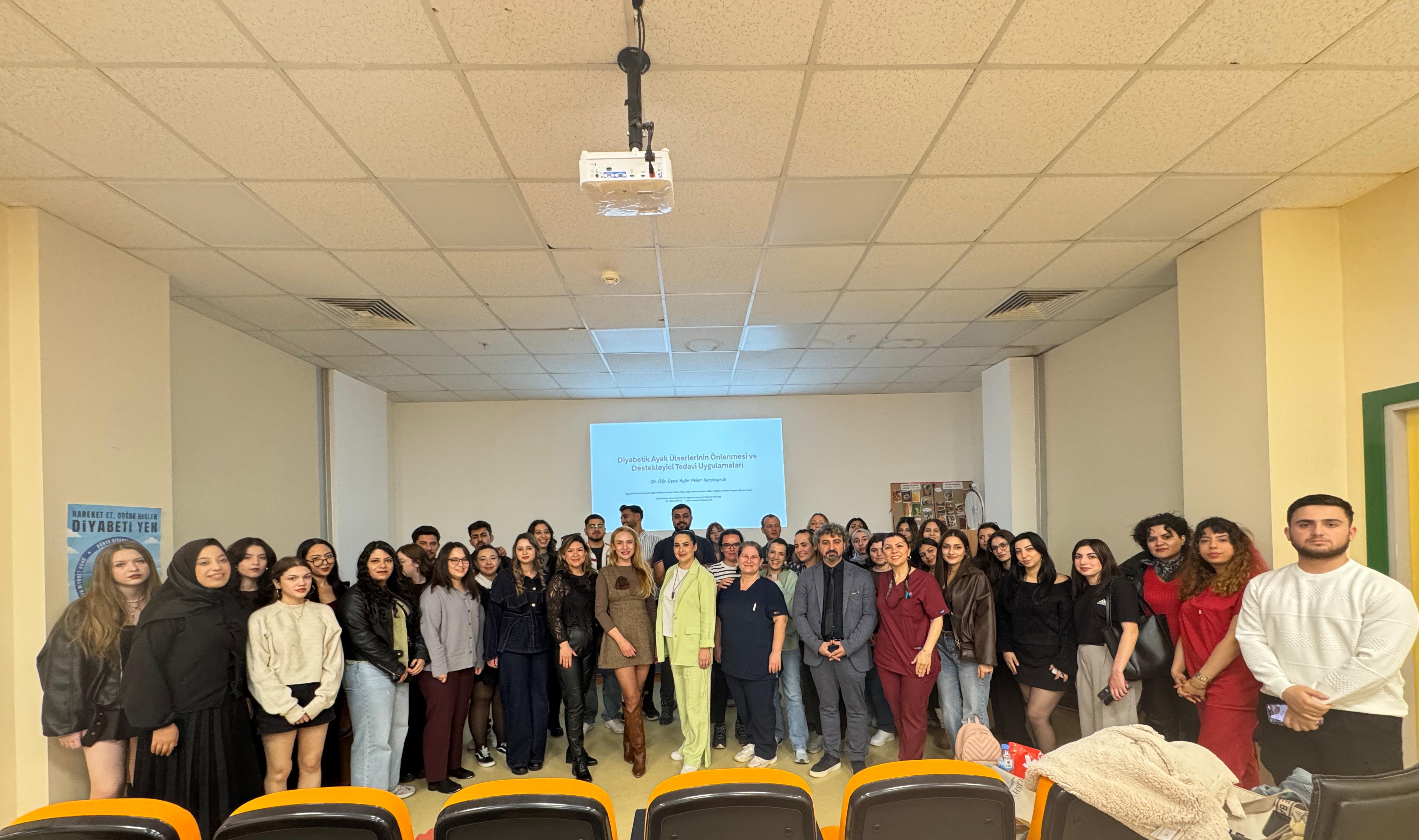 Ayrıca Dr. ÖÄŸr. Üyesi Ayfer Peker Karatoprak tarafından verilen “Diyabetik Ayak Yaralarının Korunması ve Podolojik Yaklaşımlar” baÅŸlıklı eÄŸitimde, diyabetik ayak yaralarının önlenmesi, risk deÄŸerlendirme yöntemleri ve podoloÄŸun klinik süreçteki rolü detaylı biçimde ele alınmıştır. ÖÄŸrenciler, klinik örnekleri inceleyerek mesleki farkındalıklarını artırmıştır.