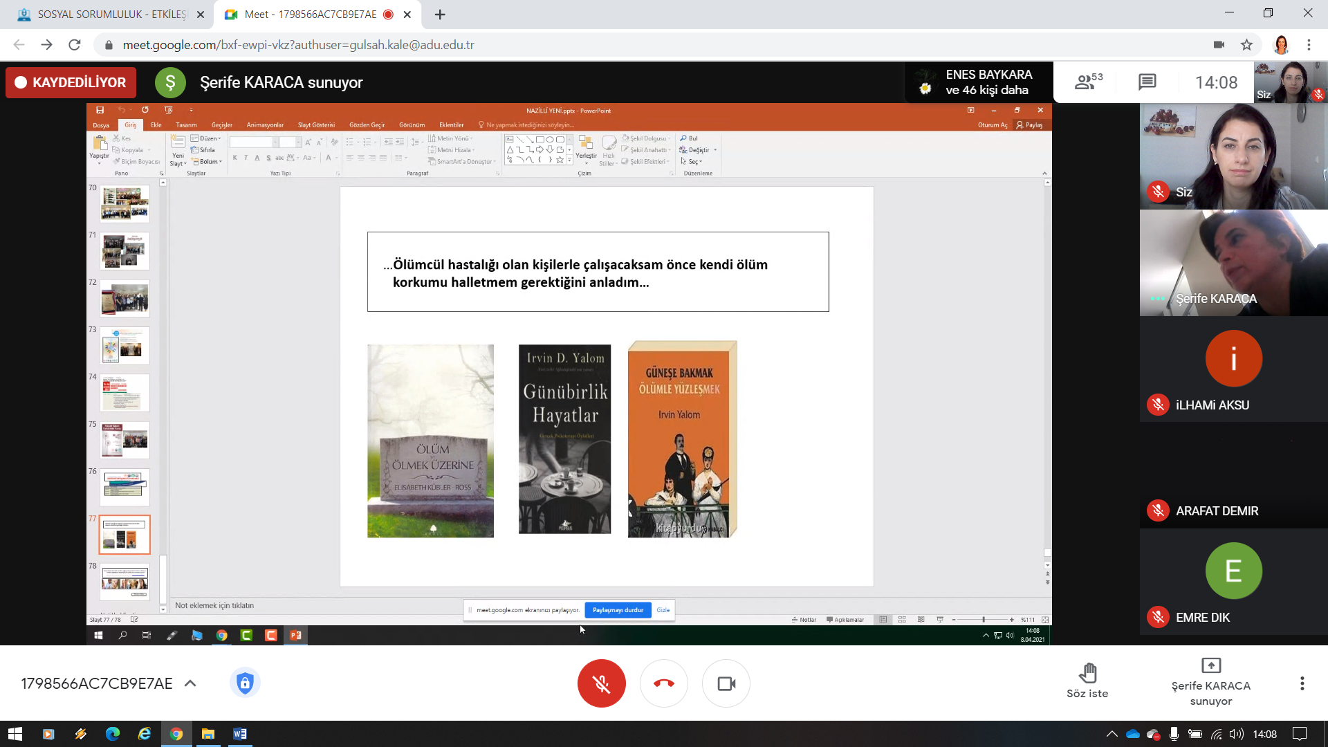 Nazilli Sağlık Hizmetleri Meslek Yüksekokulu 2020-2021 Eğitim-Öğretim Yılı Bahar Dönemi Sosyal Sorumluluk Söyleşilerinin bu haftaki konuğu Sağlık Bilimleri Üniversitesi Dr. Abdurrahman Yurtaslan Ankara Onkoloji Eğitim ve Araştırma Hastanesi Palyatif Bakım Sorumlu Hemşiresi ve Onkoloji Hemşireleri Derneği Palyatif Bakım Komisyonu üyesi Şerife KARACA idi. Moderatörlüğünü Öğr. Gör. Gülşah Şükran KALE’nin üstlendiği söyleşiye Meslek Yüksekokulu Müdürü Doç. Dr. Tuncay Ercan SEPETCİOĞLU, öğretim elemanları ve öğrencileri katılım sağladı.