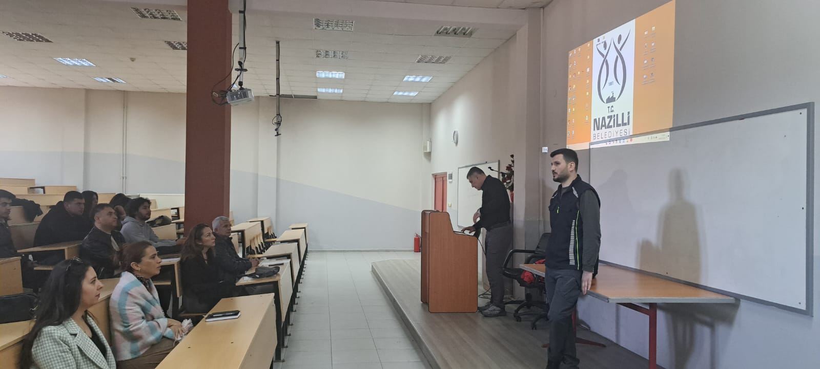 Eğitim programı kapsamında Nazilli Belediyesi İnsan Kaynakları ve Eğitim Müdürü ile Nazilli Belediyesi Afet Acil Durum Ekibi Lideri Yıldıray TOPALOĞLU ve Nazilli Belediyesi Afet Acil Durum Ekibi İlk Yardım ve Afet Acil Durum Eğitmeni Uzay TOK öğrencilerle bir araya geldi.