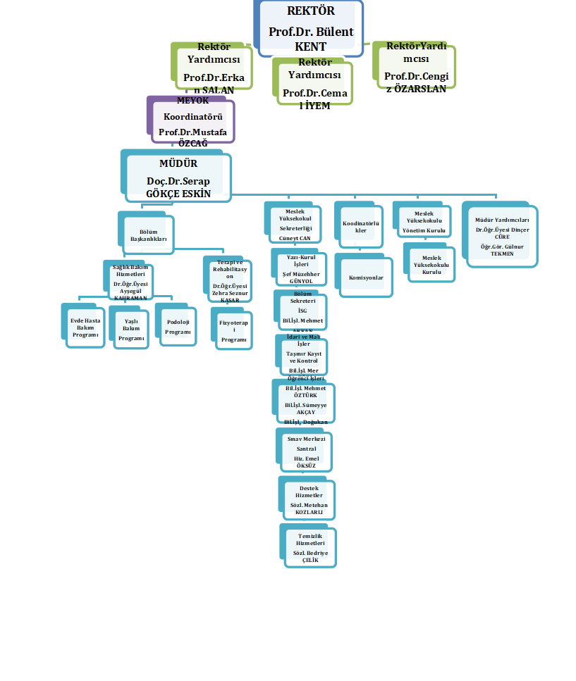 Nazilli SaÄŸlık Hizmetleri Meslek Yüksekokulu Organizasyon Åžeması, birimin yönetim yapısını, idari ve akademik birimler arasındaki iliÅŸkileri ve sorumluluk alanlarını görsel olarak sunmak amacıyla hazırlanmıştır. Bu ÅŸema, yüksekokulumuzun etkin, verimli ve ÅŸeffaf bir ÅŸekilde yönetilmesini destekleyen kurumsal yapının temel bileÅŸenlerini yansıtmaktadır.