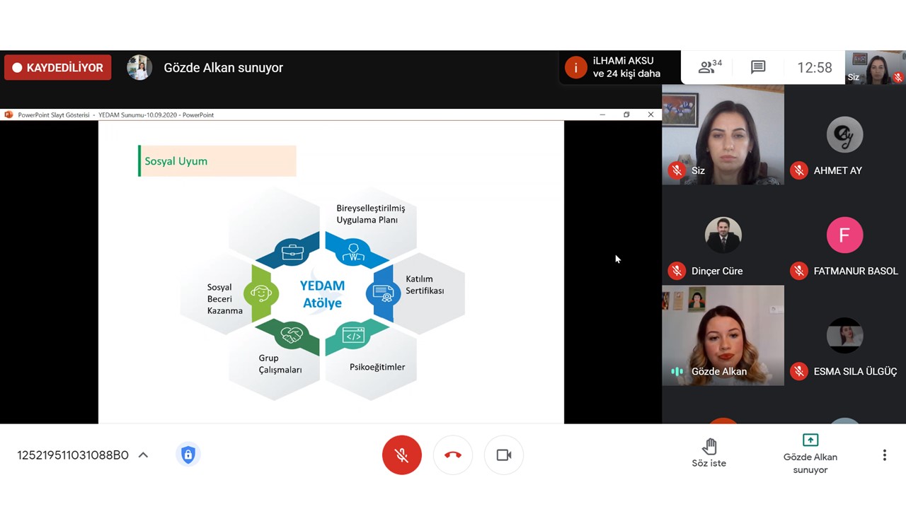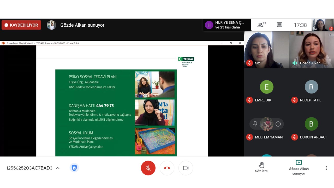 ModeratörlüÄŸünü ÖÄŸr. Gör. GülÅŸah Åžükran Kale'nin yaptığı ve Google meet uygulaması üzerinden iki ayrı oturum olarak gerçekleÅŸtirilen "Madde Bağımlılığı ile Mücadelede YeÅŸilay Danışmanlık Merkezi" baÅŸlıklı ilk söyleÅŸinin konuÄŸu, İzmir YeÅŸilay Danışmanlık Merkezi’nden (YEDAM) Sosyal Hizmet Uzmanı Gözde Alkan idi.