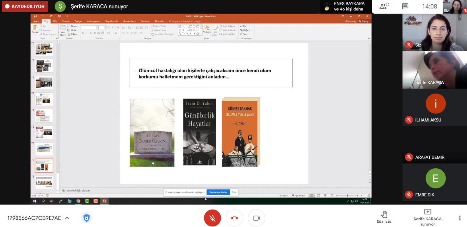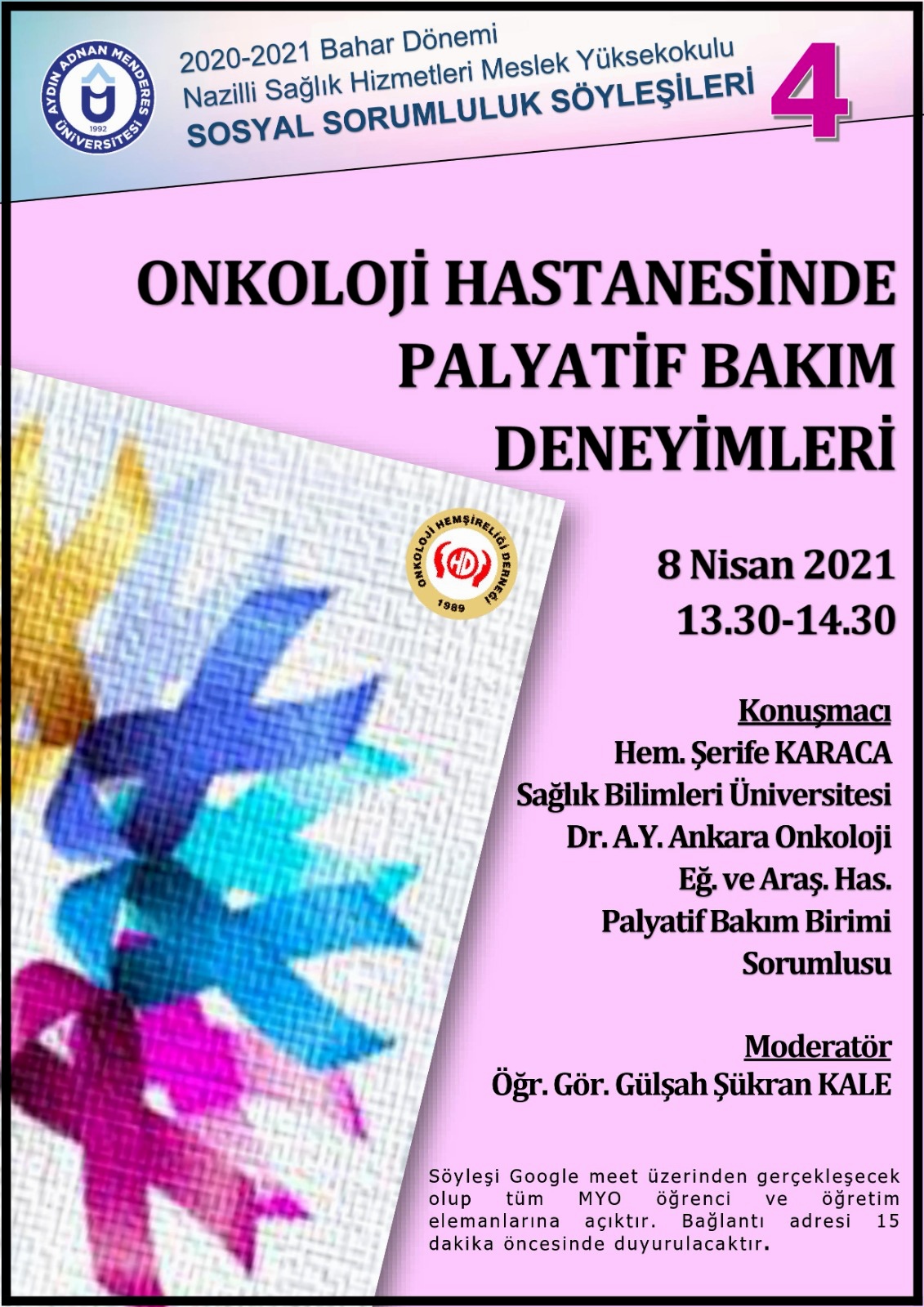 Nazilli Sağlık Hizmetleri Meslek Yüksekokulu 2020-2021 Eğitim-Öğretim Yılı Bahar Dönemi Sosyal Sorumluluk Söyleşilerinin bu haftaki konuğu Sağlık Bilimleri Üniversitesi Dr. Abdurrahman Yurtaslan Ankara Onkoloji Eğitim ve Araştırma Hastanesi Palyatif Bakım Sorumlu Hemşiresi ve Onkoloji Hemşireleri Derneği Palyatif Bakım Komisyonu üyesi Şerife KARACA idi. Moderatörlüğünü Öğr. Gör. Gülşah Şükran KALE’nin üstlendiği söyleşiye Meslek Yüksekokulu Müdürü Doç. Dr. Tuncay Ercan SEPETCİOĞLU, öğretim elemanları ve öğrencileri katılım sağladı.