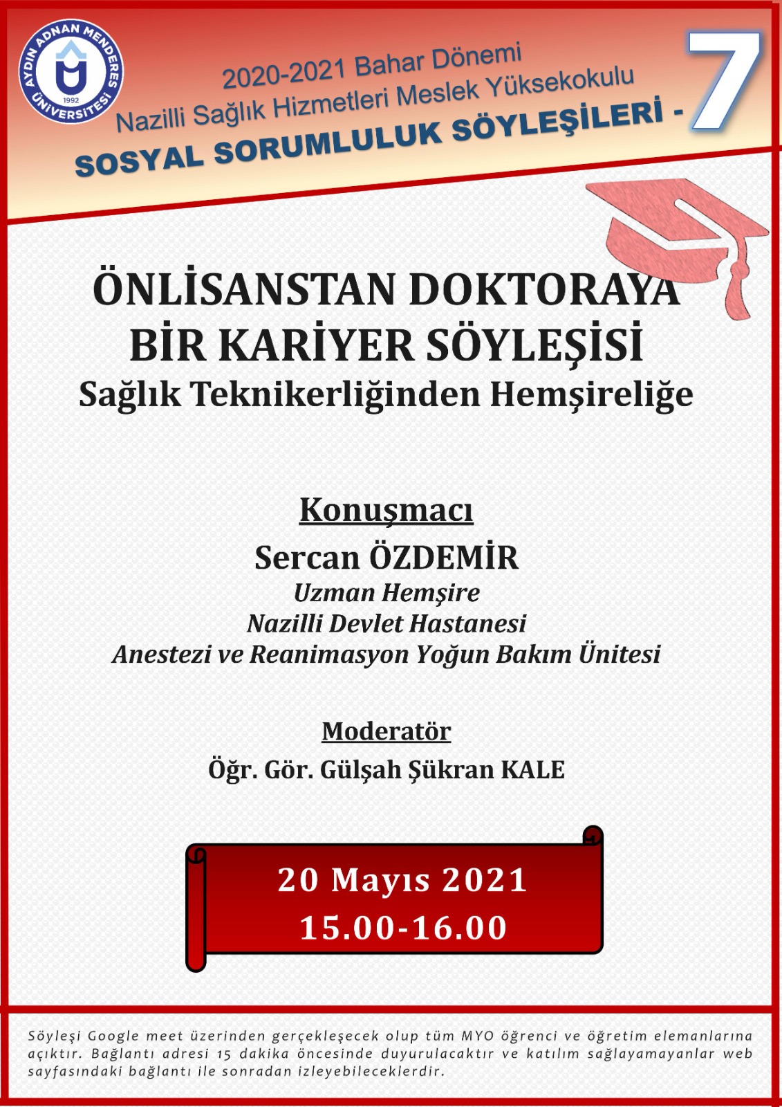 Nazilli SaÄŸlık Hizmetleri Meslek Yüksekokulu 2020-2021 EÄŸitim-ÖÄŸretim Yılı Bahar Dönemi Sosyal Sorumluluk SöyleÅŸilerinin 20 Mayıs 2021 tarihli söyleÅŸisindeki konuÄŸu Nazilli Devlet Hastanesi Anestezi ve Reanimasyon YoÄŸun Bakım Ünitesi’nde görevli Uzm. HemÅŸire Sercan ÖZDEMİR idi. ModeratörlüÄŸünü ÖÄŸr. Gör. GülÅŸah Åžükran KALE’nin üstlendiÄŸi söyleÅŸiye okul öÄŸretim elemanları ve öÄŸrencileri katılım saÄŸladı.