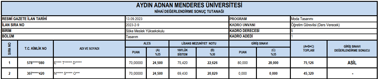 Öğretim Görevlisi Alımı Nihai Değerlendirme Sonucu