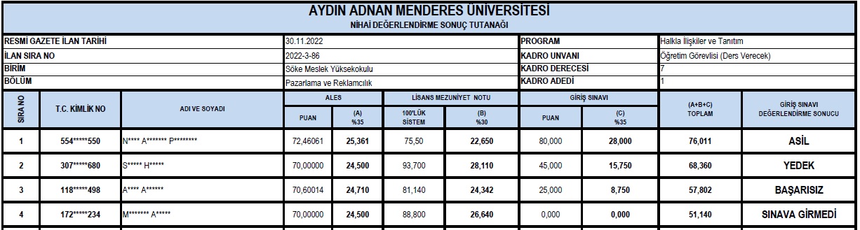 Pazarlama ve Reklamcılık Bölümü Öğretim Elemanı Değerlendirme Sonucu