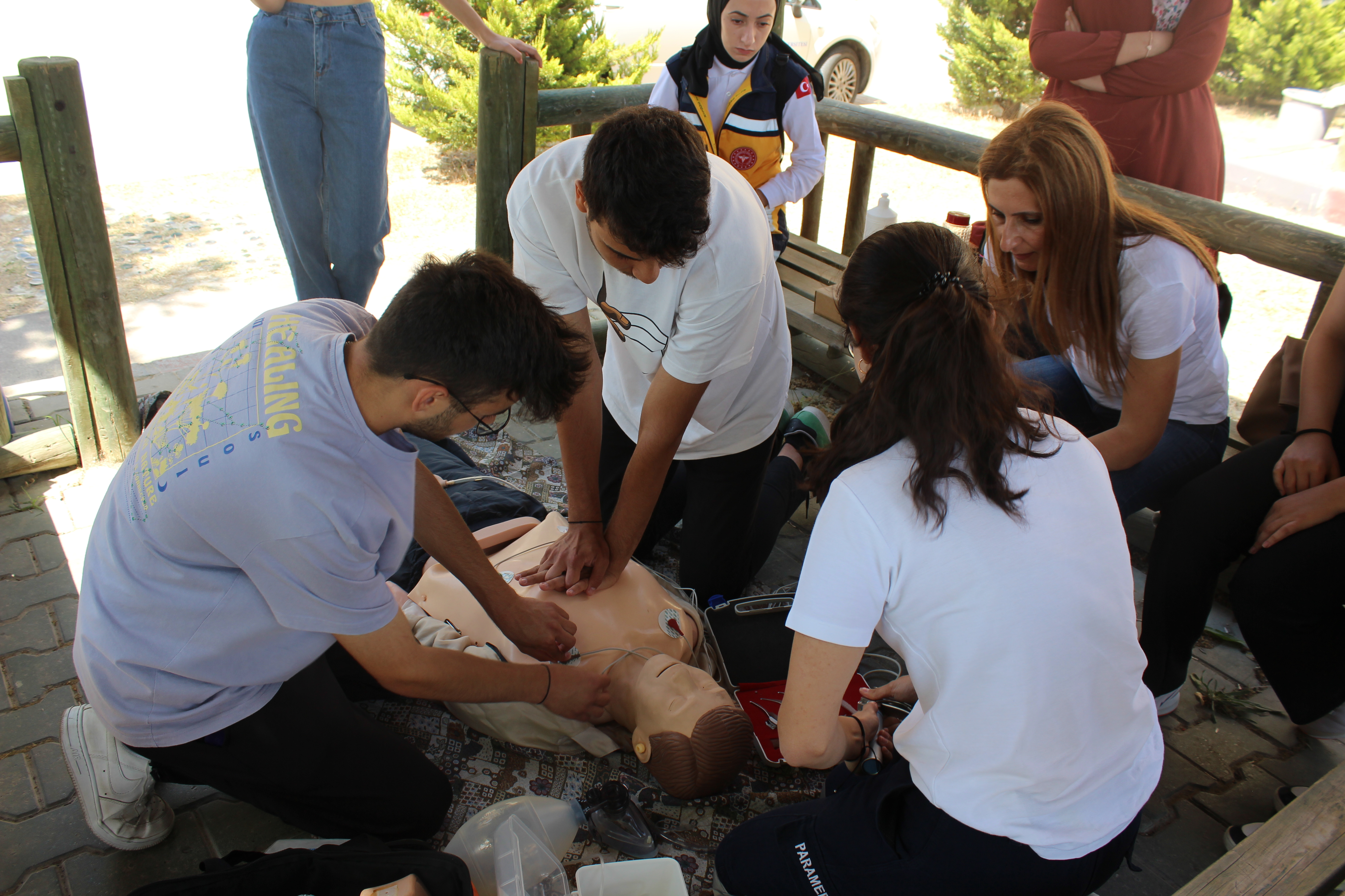 Taşıma Teknikleri Etabında ise öÄŸrenciler tarafından vücut mekaniklerine dikkat edilerek hasta/yaralının güvenli bir ÅŸekilde bulunduÄŸu yerden doÄŸru teknikle boyunluk takılması ve omurga tahtasına alınmasının yanı sıra farklı taşıma araçlarını (ana sedye, vakum sedye, kombinasyon sedye ve faraÅŸ (kepçe) sedye vb.) kullanarak ambulansa koyma ve çıkarma gibi nakil aÅŸamaları gerçekleÅŸtirdiler.