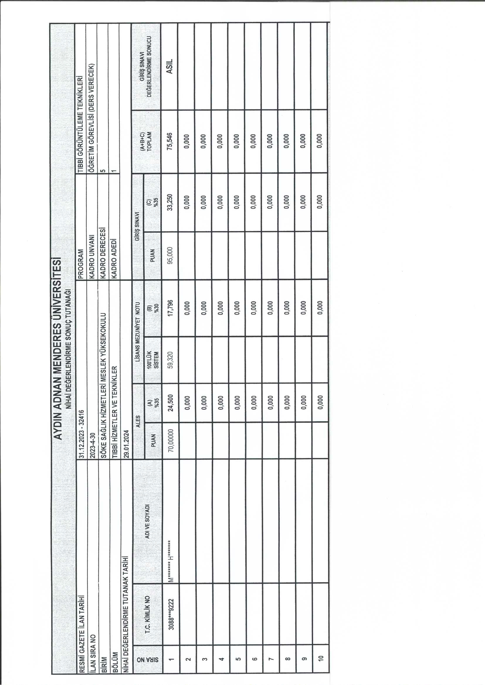 Öğretim Üyesi Dışındaki Öğretim Elemanı Kadrolarına Yapılacak Atamalarda Uygulanacak Merkezi Sınav İle Giriş Sınavlarına İlişkin Usul ve Esaslar Hakkında Yönetmelik hükümleri uyarınca 31.12.2023 tarihli ve 32416 sayılı Resmi Gazete’de yayımlanan ilan metni çerçevesinde Yüksekokulumuz Tıbbi Hizmetler ve Teknikler Bölümü Tıbbi Görüntüleme Teknikleri Programı 5. Derece Öğretim Görevlisi (Ders Verecek) kadrosu Nihai Değerlendirme sonucu ekteki gibidir.