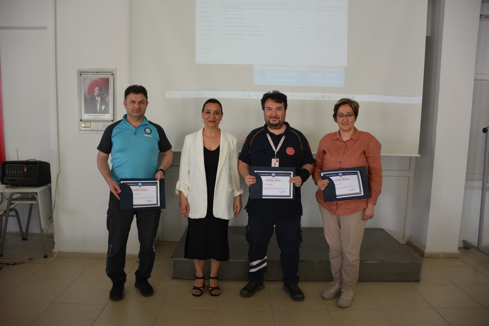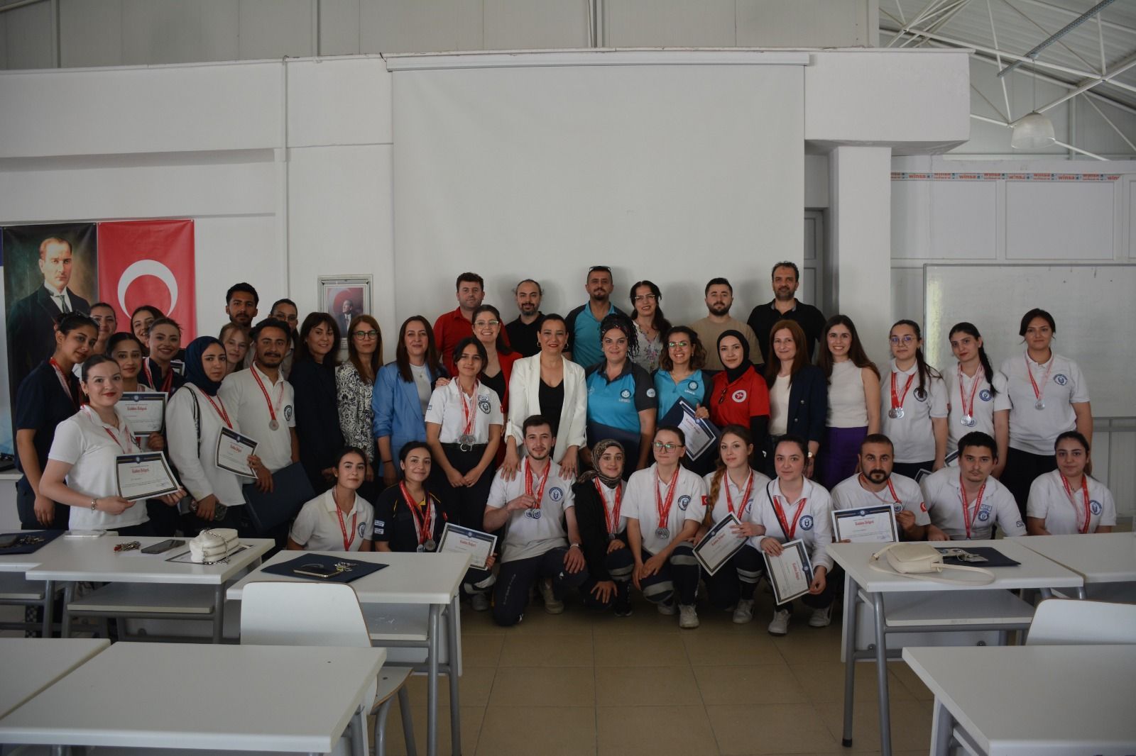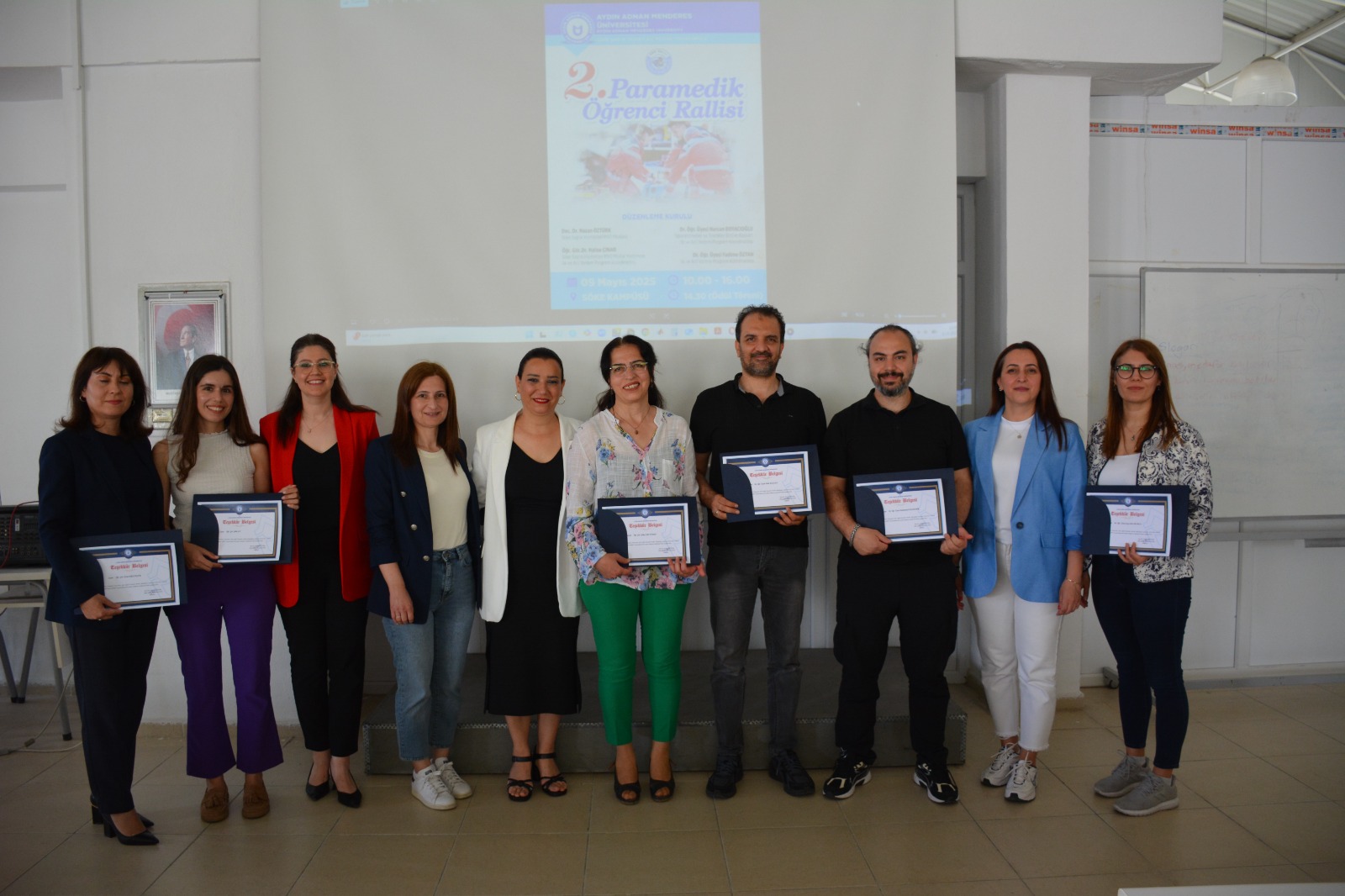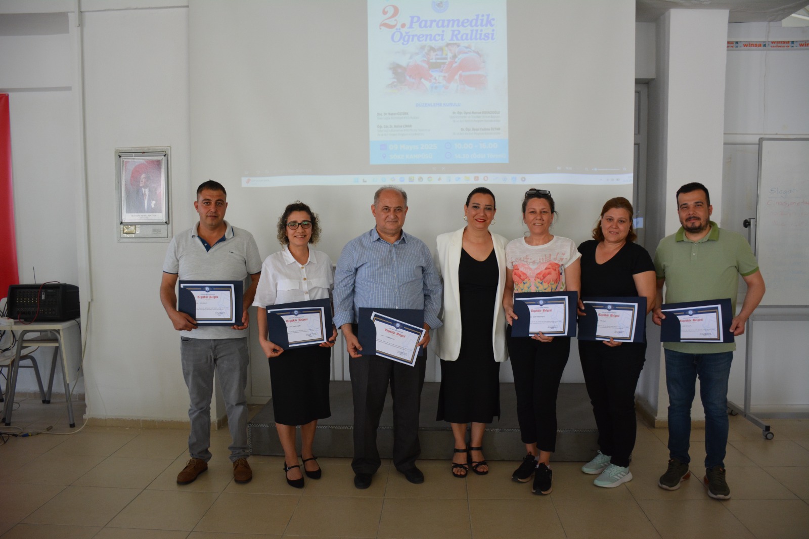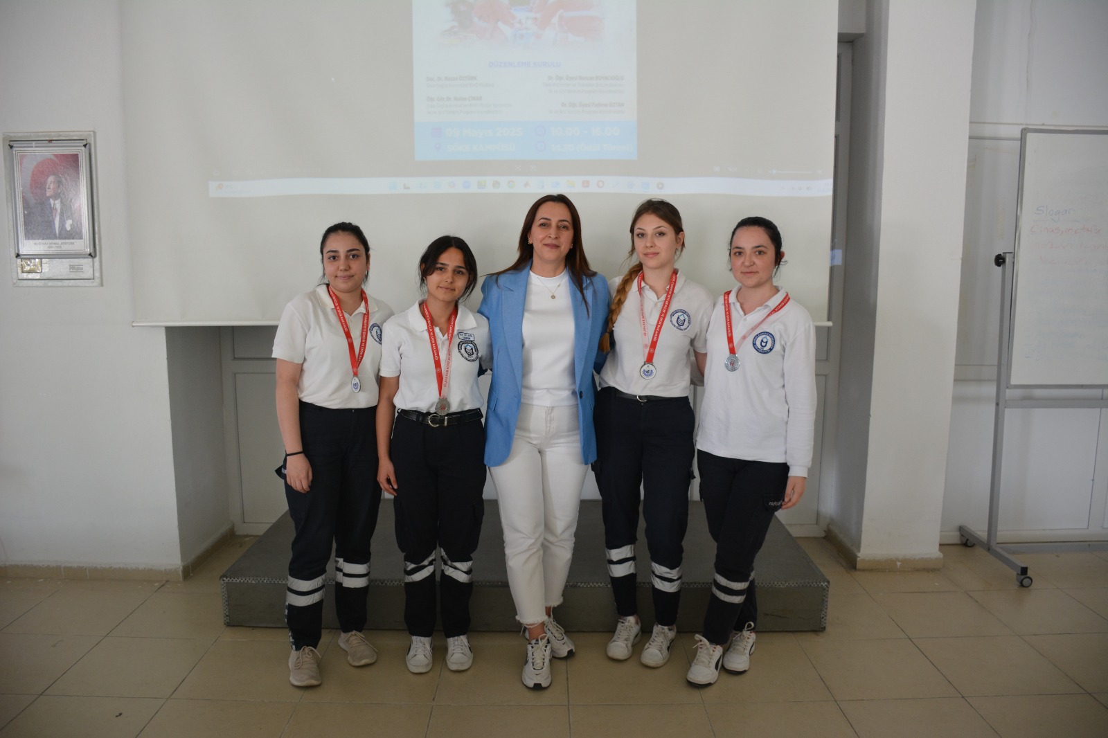 Üniversitemiz Söke İşletme Fakültesi Dekan Yardımcıları Doç. Dr. Beyza Erer ve Dr. Öğr. Üyesi Özgür Balmumcu, Akademik ve İdari Personel, Aydın İl Sağlık Müdürlüğü Sağlık Hizmetleri Başkan Yardımcısı Mehmet Yılmaz, Aydın İl Sağlık Müdürlüğü Ambulans Servisi Başhekimi Dr. Burak Görür ve Aydın İl Sağlık Müdürlüğü Ambulans Servisi Başhekim Yardımcısı Dr. Okşan Komesli ve Meryem Yazıcıoğlu KYK Kız Öğrenci Yurdu Müdürü Aynur Kirişçi’nin de katılımıyla gerçekleştirilen ödül töreninde, dereceye giren öğrencilere madalyalarının verilmesi ile etkinlik sona erdi.