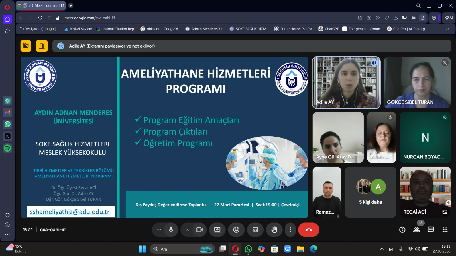 Aydın Adnan Menderes Üniversitesi Söke Sağlık Hizmetleri Meslek Yüksekokulu Ameliyathane Hizmetleri Programı tarafından, eğitim-öğretim süreçlerinin geliştirilmesi, sektör beklentileri doğrultusunda güncellenmesi, kalite güvencesi çalışmalarının güçlendirilmesi ve dış paydaş görüşlerinin alınması amacıyla 27 Mart 2026 tarihinde saat 19.00’da çevrim içi dış paydaş toplantısı gerçekleştirilmiştir.