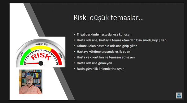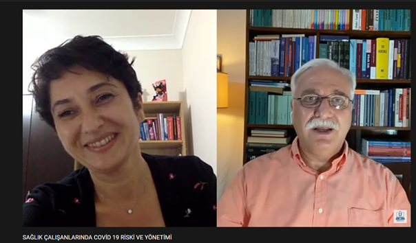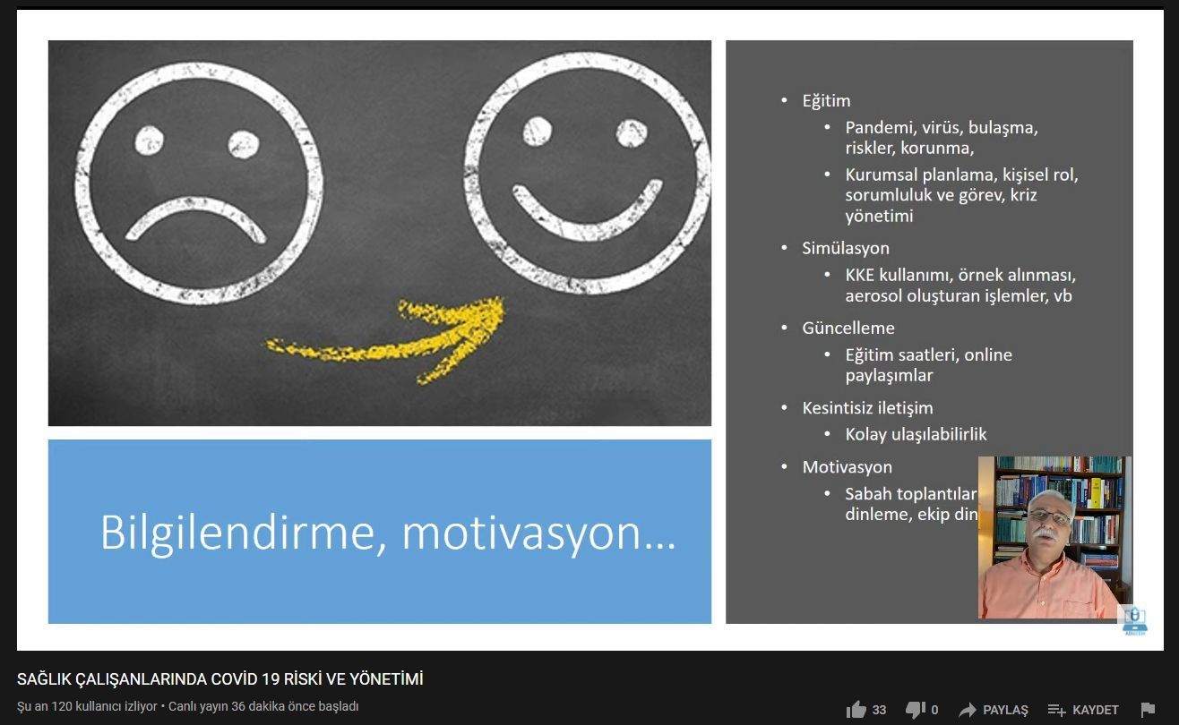 Söke SaÄŸlık Hizmetleri MYO Müdürü Prof. Dr. RahÅŸan ÇEVİK AKYIL’ın açılış konuÅŸması ile baÅŸlayan etkinlik Prof. Dr. Tevfik ÖZLÜ’nün SaÄŸlık Çalışanlarında Covid 19 Riski ve Yönetimi sunumu ile devam etti. Prof. Dr. Tevfik ÖZLÜ sunumunda SaÄŸlık Çalışanlarında Enfeksiyon Riski, SaÄŸlık Çalışanlarında BulaÅŸma Yolları, Koruyucu Önlemler ve Temaslı Yönetimi konularına deÄŸindi. Güncellenen bilgilere göre Covid 19’un bulaÅŸma yolları, temaslı saÄŸlık çalışanlarının yönetim algoritması hakkında bilgi veren Dr. ÖZLÜ koruyucu önlemlerde el hijyeni, bilgilendirme ve motivasyonun önemini vurguladı.