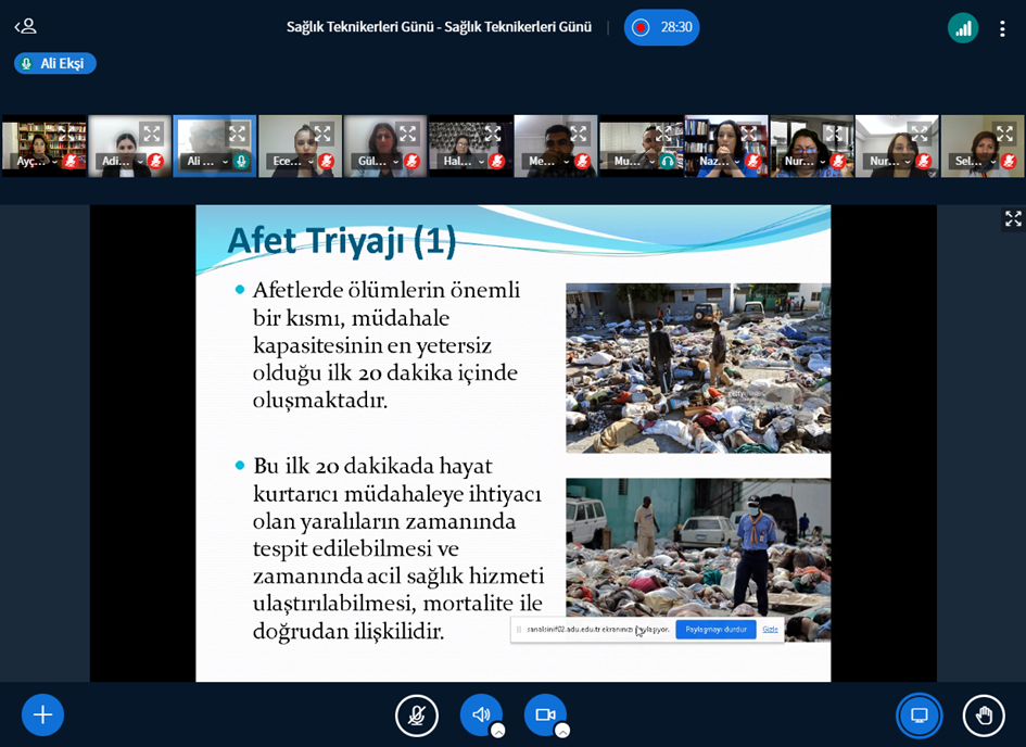 Program; Ege Üniversitesi Atatürk SaÄŸlık Hizmetleri MYO Müdürü Doç. Dr. Ali EkÅŸi'nin "Afet Triyajında Etik İlke ve İkilemler" sunumu ile baÅŸladı. KonuÅŸmasında; ülkemizde 6 Åžubat 2023 tarihinde KahramanmaraÅŸ merkezli yıkıcı depremler, sel felaketleri, çığ, radyasyon kazaları, patlamalar ve kitlesel kazalar gibi afetlerle karşı karşıya kalındığını ve gelecekte de bu durumla karşılaÅŸabileceÄŸini belirtti. Doç. Dr. Ali EkÅŸi, afetlerde afetzedelere acil saÄŸlık hizmeti sunmak, yaralıların zamanında tespit edilmesi, kıt kaynakların hayati risk taşıyan ve yaÅŸama ÅŸansı olan yaralılara aktarılması amacıyla yapılan triyaj (ayırma) uygulamalarının önemine vurgu yaptı. Paramedik öÄŸrencilerine meslek hayatlarında birçok afetle karşılaÅŸabileceklerini ve afetlerde triyaj uygularken uyulması gereken etik ilkeleri hatırlatarak bilgilerini aktaran Doç. Dr. EkÅŸi, ardından sözü Üniversitemiz Tıp Fakültesi Radyasyon Onkolojisi AD Dr. ÖÄŸr. Üyesi Nural Öztürk'e devretti. Dr. ÖÄŸr. Üyesi Öztürk, Türkiye'de ve Dünyadaki radyasyon kazalarına iliÅŸkin çarpıcı örnekleri ve korunma yollarına iliÅŸkin önemli bilgileri katılımcılarla paylaÅŸtı. MuÅŸ Alparslan Üniversitesi SaÄŸlık Hizmetleri MYO ÖÄŸr. Gör. Mesut Yılmaz, “Ameliyathane TeknikerliÄŸi EÄŸitiminde Güncel Yaklaşımlar” isimli sunumuyla alanındaki güncel yaklaşımları katılımcılar ile paylaÅŸarak, ameliyathanede kullanılan son teknolojik görüntüleme sistemleri, 3D gözlük simülasyon uygulamaları ile gerçekliÄŸe yakın ameliyat deneyimiyle eÄŸitimin desteklenebileceÄŸine vurgu yaptı. ÖÄŸr. Gör. Yılmaz, halihazırda var olan, öÄŸrencilerin uygulama eÄŸitiminde kullanılan ameliyathane laboratuvarı ile ilgili görüntüleri sunumunda paylaÅŸtı. ÖÄŸr. Gör. Yılmaz; ameliyathanede çalışan her bir saÄŸlık profesyonelinin deÄŸerli olduÄŸunu ve bunu öÄŸrencilere hissettirmeye çalıştığını belirterek sunumunu sonlandırdı.