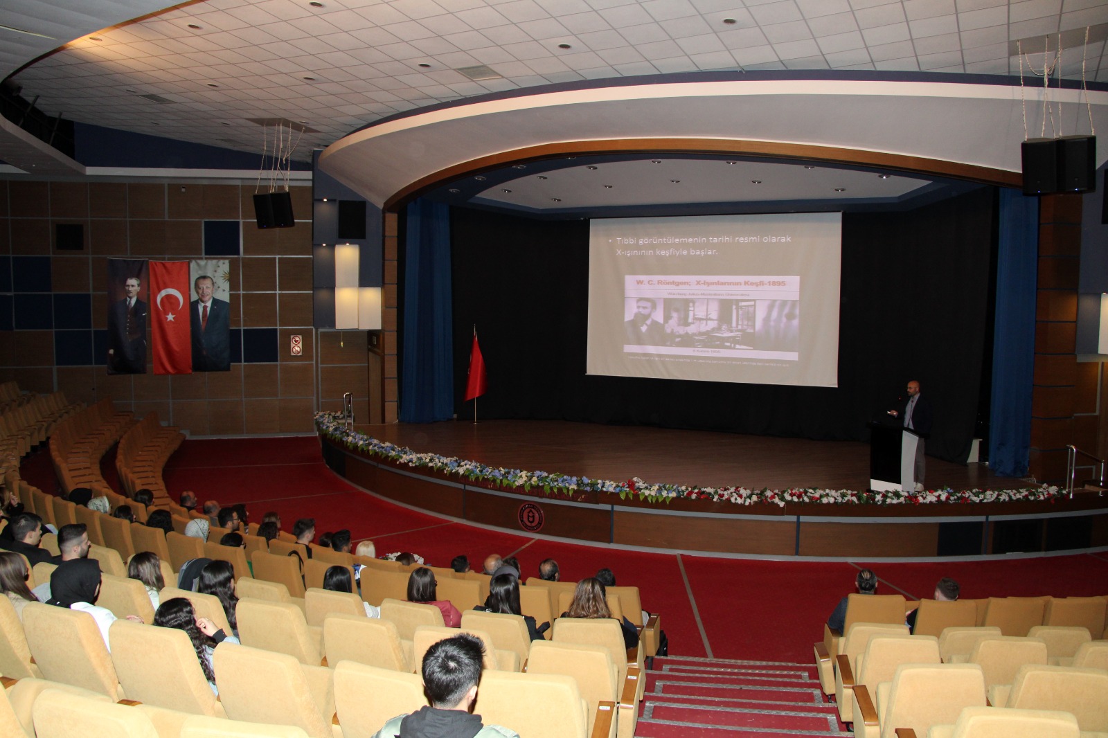 Radyolojinin tıptaki önemini vurgulamak, sağlık profesyonellerini bu alandaki yenilikler hakkında bilgilendirmek amacıyla düzenlenen etkinlikte, Dr. Öğr. Üyesi Göksel Tuzcu “Noktadan 3. Boyuta: Radyolojinin 120 Yıllık Tarihi”, Öğr. Gör. Dr. Mesut Ekmekçi “Günlük Hayatta Radyasyon”, Öğr. Gör. Dr. Muhammed Hasdemir “Radyolojide Yapay Zekâ” ve Tekniker Zatiye Hüner “Bir Röntgen Teknikerinin Kariyer Yolculuğu” başlıklı konular hakkında katılımcılara bilgi verdi.