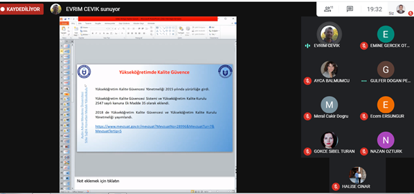 Eğitimin açılış konuşmasında Yüksekokul Müdürü Doç. Dr. Emine GERÇEK ÖTER yükseköğretimde kalite kavramı ve kalite süreçlerinin önemini vurgulayarak, eğitimin verimli geçmesini temenni etti. Yüksekokul Müdürü Doç. Dr. Emine GERÇEK ÖTER’in konuşmasının ardından üniversitemizin Kalite Komisyonunda yer alan Kalite Kurulu Üyesi Koçarlı Meslek Yüksekokulu öğretim elemanı Öğr. Gör. Evrim ÇEVİK, yükseköğretimde kalite güvence ve kalite süreçleri konuları hakkında ayrıntılı bilgi verdi.