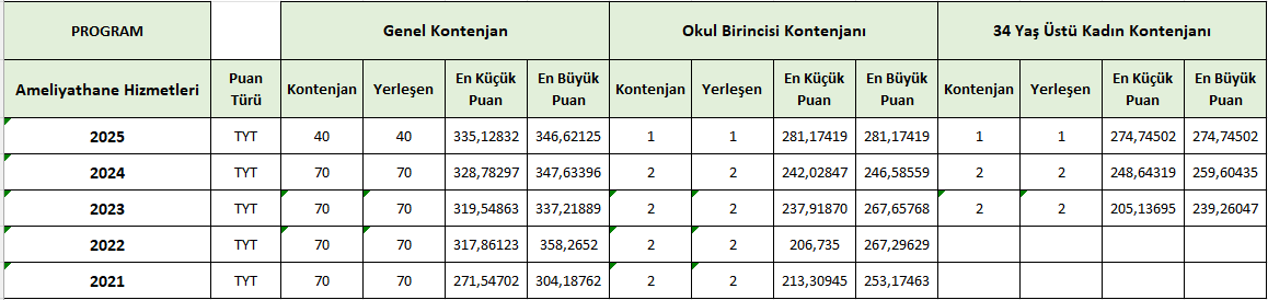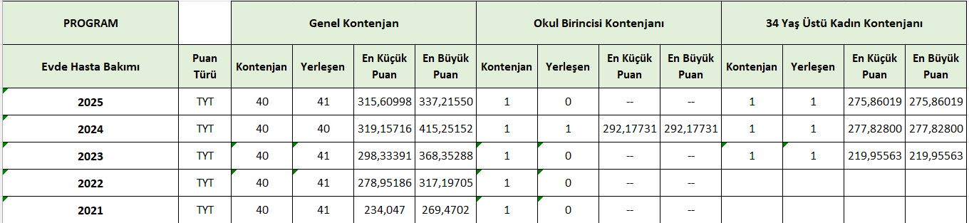 Söke SaÄŸlık Hizmetleri Meslek Yüksekokulu’nun Ameliyathane Hizmetleri, İlk ve Acil Yardım, Tıbbi Görüntüleme Teknikleri ve Evde Hasta Bakımı programlarına iliÅŸkin 2021–2025 dönemini kapsayan yerleÅŸtirme verileri tablolaÅŸtırılmıştır.