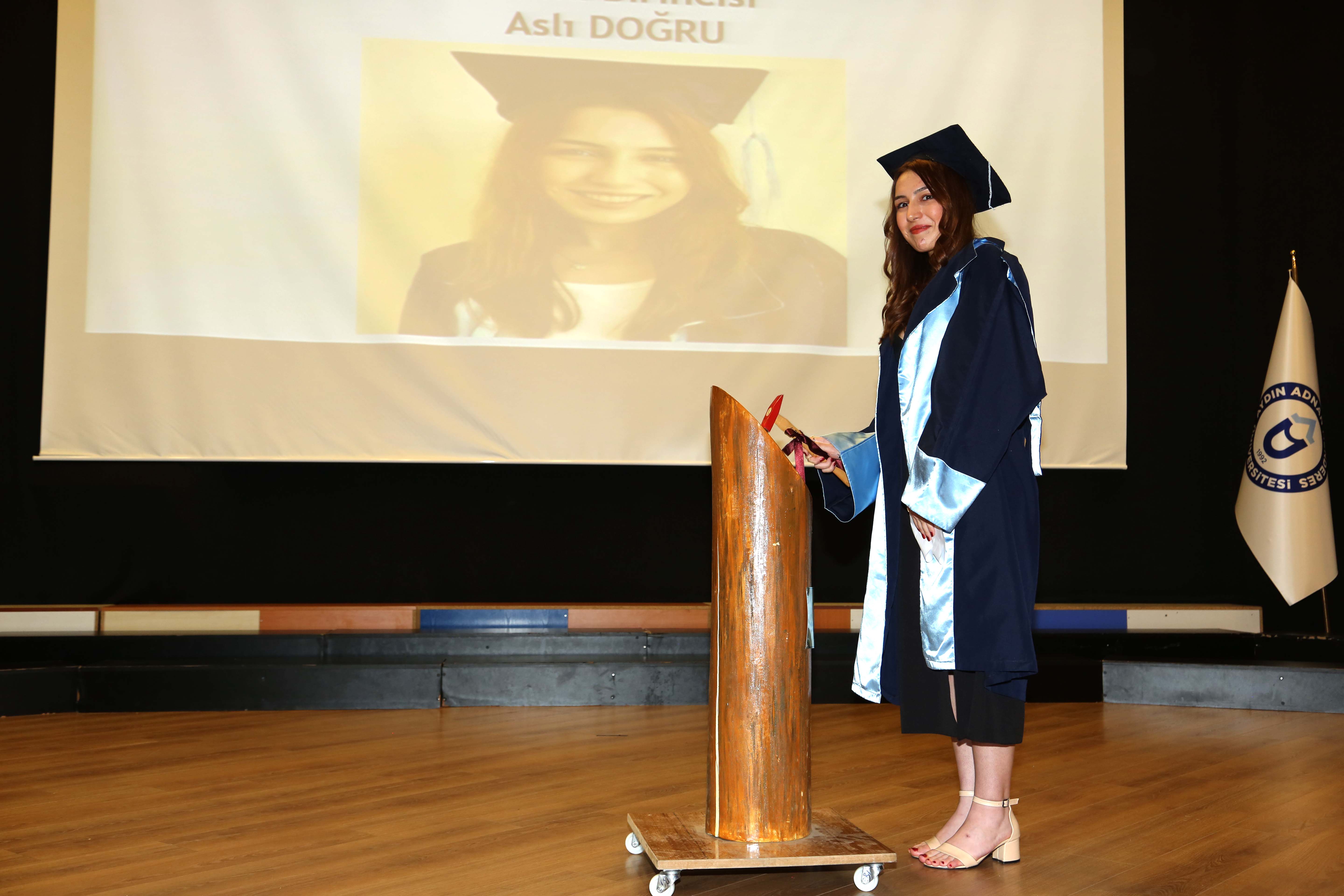 Söke SaÄŸlık Hizmetleri Meslek Yüksekokulu 2022-2023 Akademik Yılı birincisi Aslı DoÄŸru konuÅŸmasında emeklerinden dolayı öÄŸretim üyelerine ve ailelerine teÅŸekkür ederek mezuniyet kütüÄŸüne plakasını çaktı.