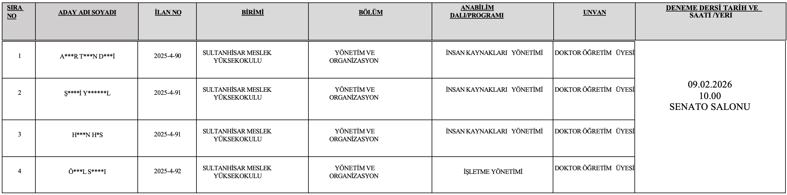 Üniversitemizin akademik personel ihtiyacının karşılanması amacıyla 31.12.2025 tarihli ve 33124 sayılı Resmî Gazete’ de yayımlanan Öğretim Üyesi Alım İlanında yer alan Doktor Öğretim üyesi kadrolarına başvuran ve deneme dersine girmeye hak kazanan adayların deneme dersi gün, saat ve yeri tabloda belirtilmiştir.