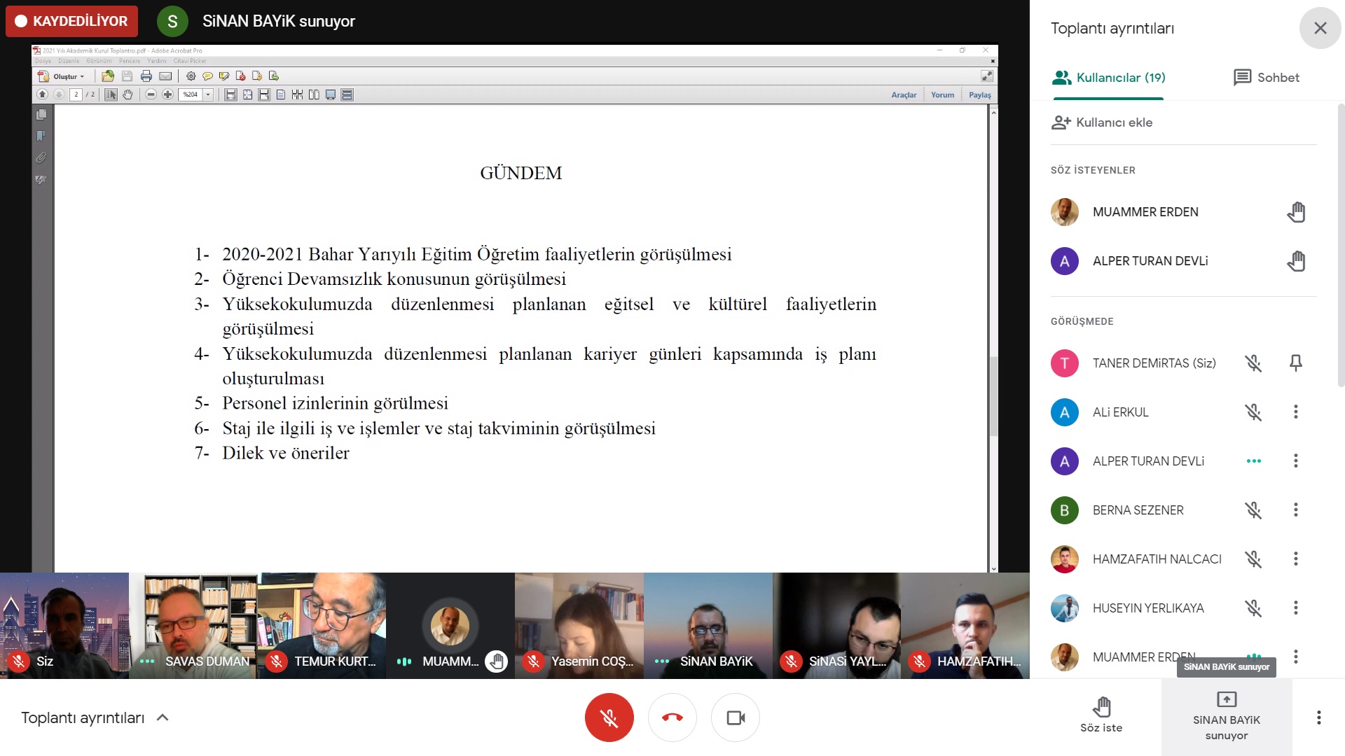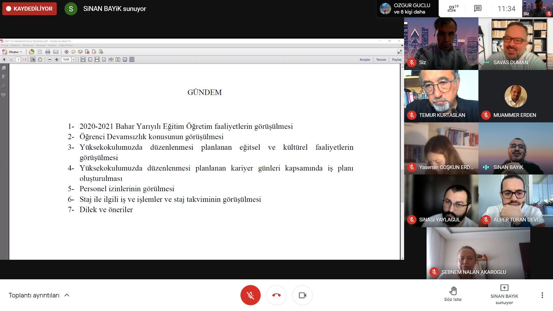 Birinci gündem maddesi olarak, 2020-2021 yılı bahar yarı yılı eğitim öğretim faaliyetleri ele alınarak başlayan toplantı, yapılması planlanan proje bazlı sosyal ve kültürel etkinliklerinin ele alındığı toplantıda; altı ana başlıktan oluşan diğer gündemleri tek tek görüşüldü.
