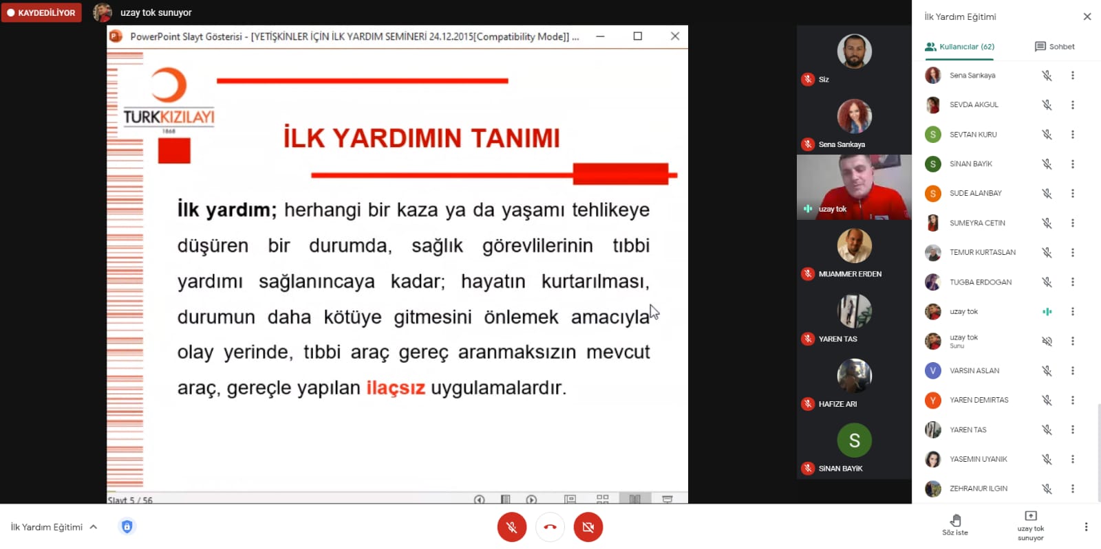 Yaklaşık bir saat süren ilk yardım seminerinde, Herhangi bir kaza veya yaşamı tehlikeye düşüren bir durumda, sağlık görevlilerinin yardımı sağlanıncaya kadar, hayatın kurtarılması ya da durumun kötüye gitmesini önleyebilmek amacı ile olay yerinde, tıbbi araç gereç aranmaksızın, mevcut araç ve gereçlerle yapılan uygulamanın günlük yaşamımızaki önemi belirtildi.
