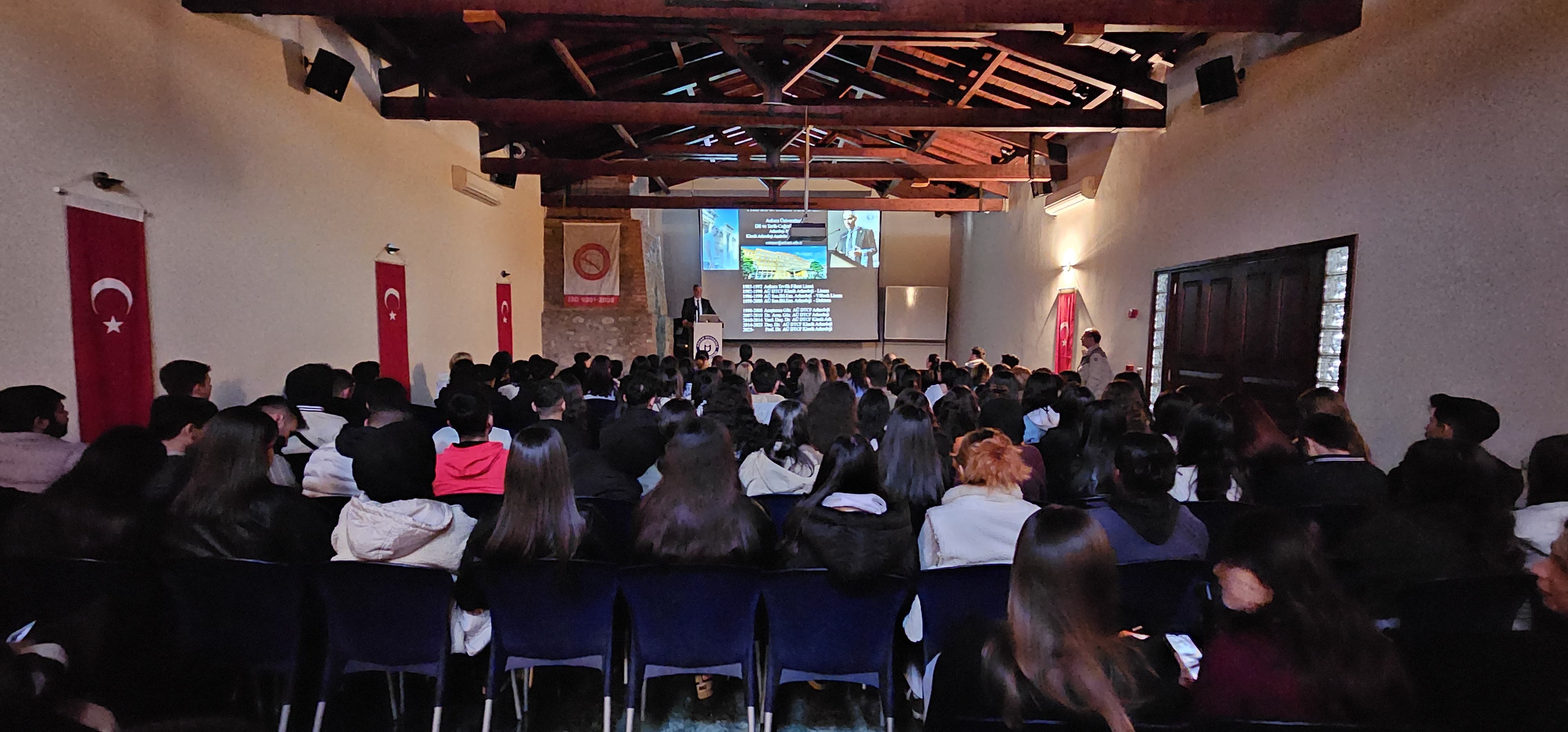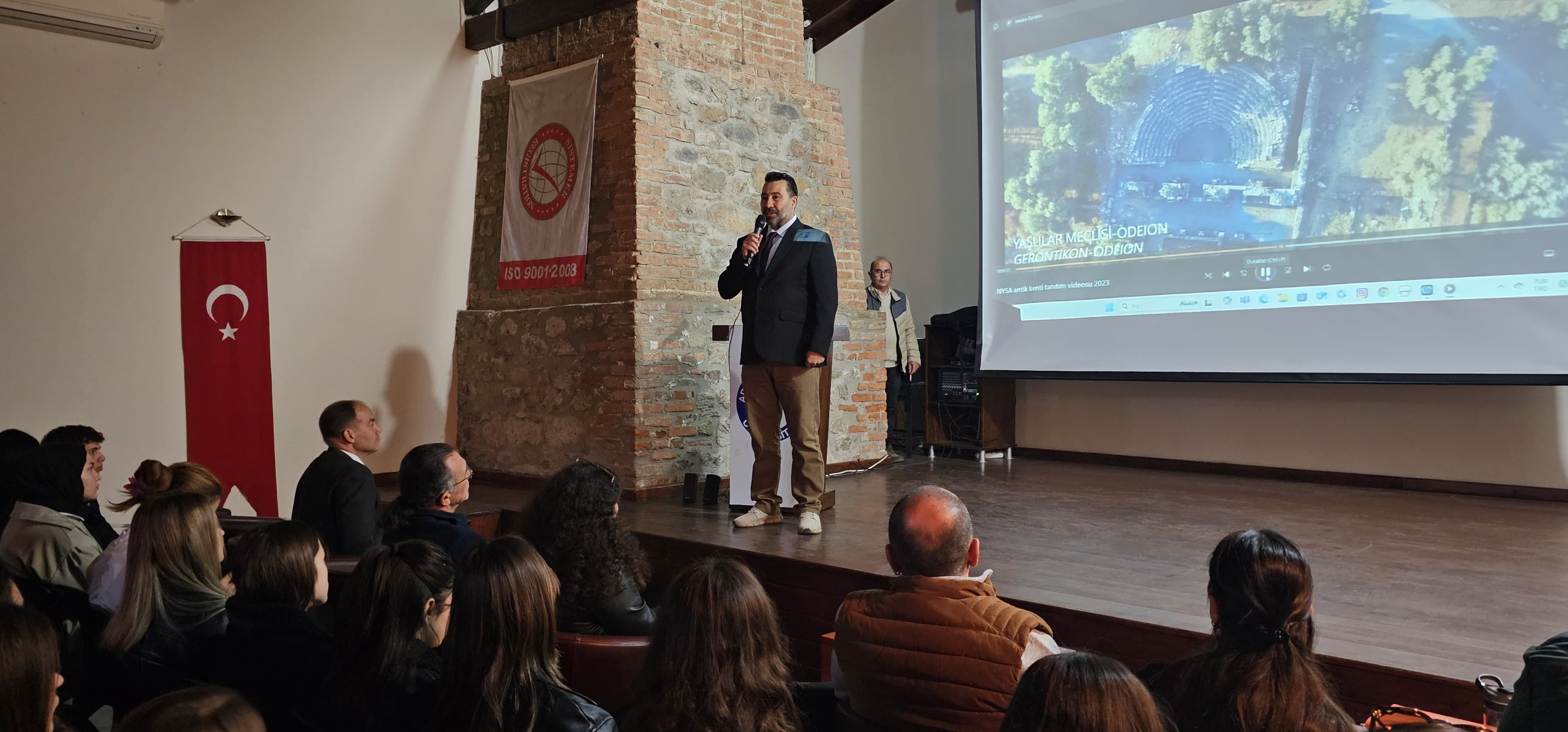 Sunumda; Prof. Dr. Hakan ÖZTANER tarafından Nysa Antik Kentin kuruluÅŸ amacı, tarihi, fizyolojik yapısı, kimler tarafından yönetildiÄŸinin yanı sıra kazılarda çıkarılan tarihi eserlerin sergilendiÄŸi müzelerin önemi hakkında bilgiler verdi.