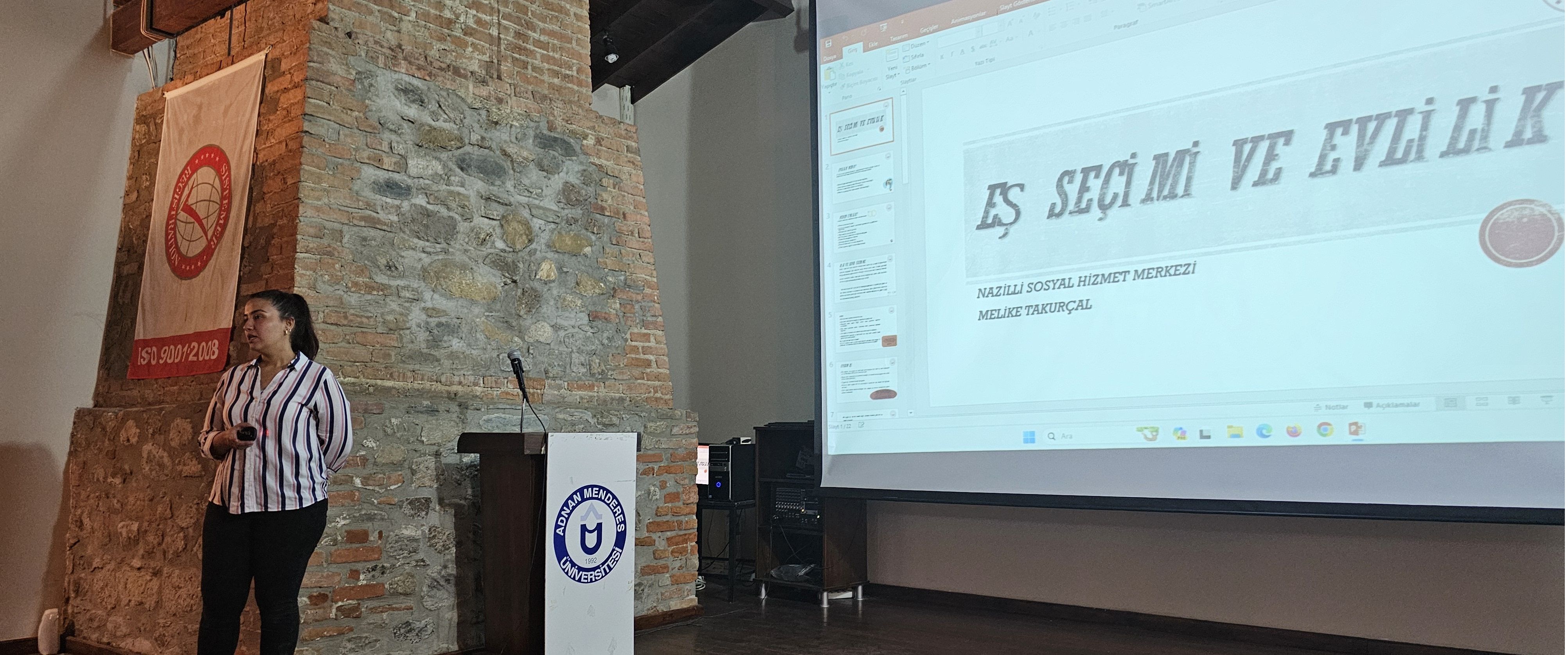 Nazilli Sosyal Hizmet Merkezi Müdürlüğü Sosyolog Melike TAKURÇAL tarafından Aydın Adnan Menderes Üniversitesi Sultanhisar Meslek Yüksekokulu ön lisans programlarında öğrenim gören kız öğrencilerine yönelik 22/05/2024 tarihinde “Evlilik Öncesi,” “Aile İçi iletişimin Temel Unsurları” ile “Kadına Yönelik Şiddette Mücadele Farkındalık” konularında eğitim düzenlendi.