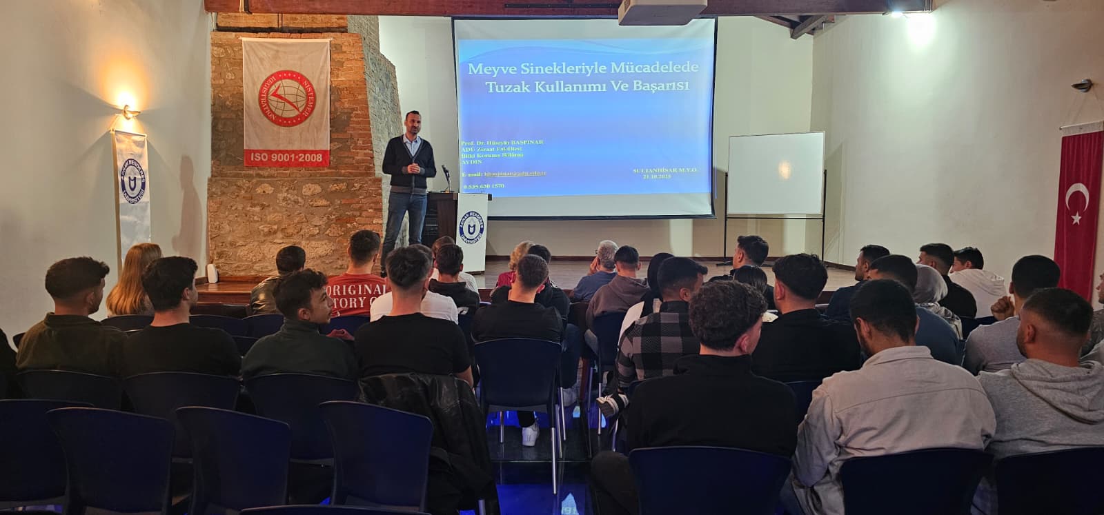 Sultanhisar Meslek Yüksekokulu, Bitkisel ve Hayvansal Üretim Bölümü, Bitki Koruma Programı tarafından 21.10.2025 tarihinde, AHB konferans salonunda "Meyve Sinekleriyle Mücadelede Tuzak Kullanımı ve BaÅŸarısı" konulu bir etkinlik düzenlendi. EtkinliÄŸe okulun öÄŸretim elemanları ve tarımsal programlarda öÄŸrenim gören öÄŸrenciler yoÄŸun katılım gösterdi.