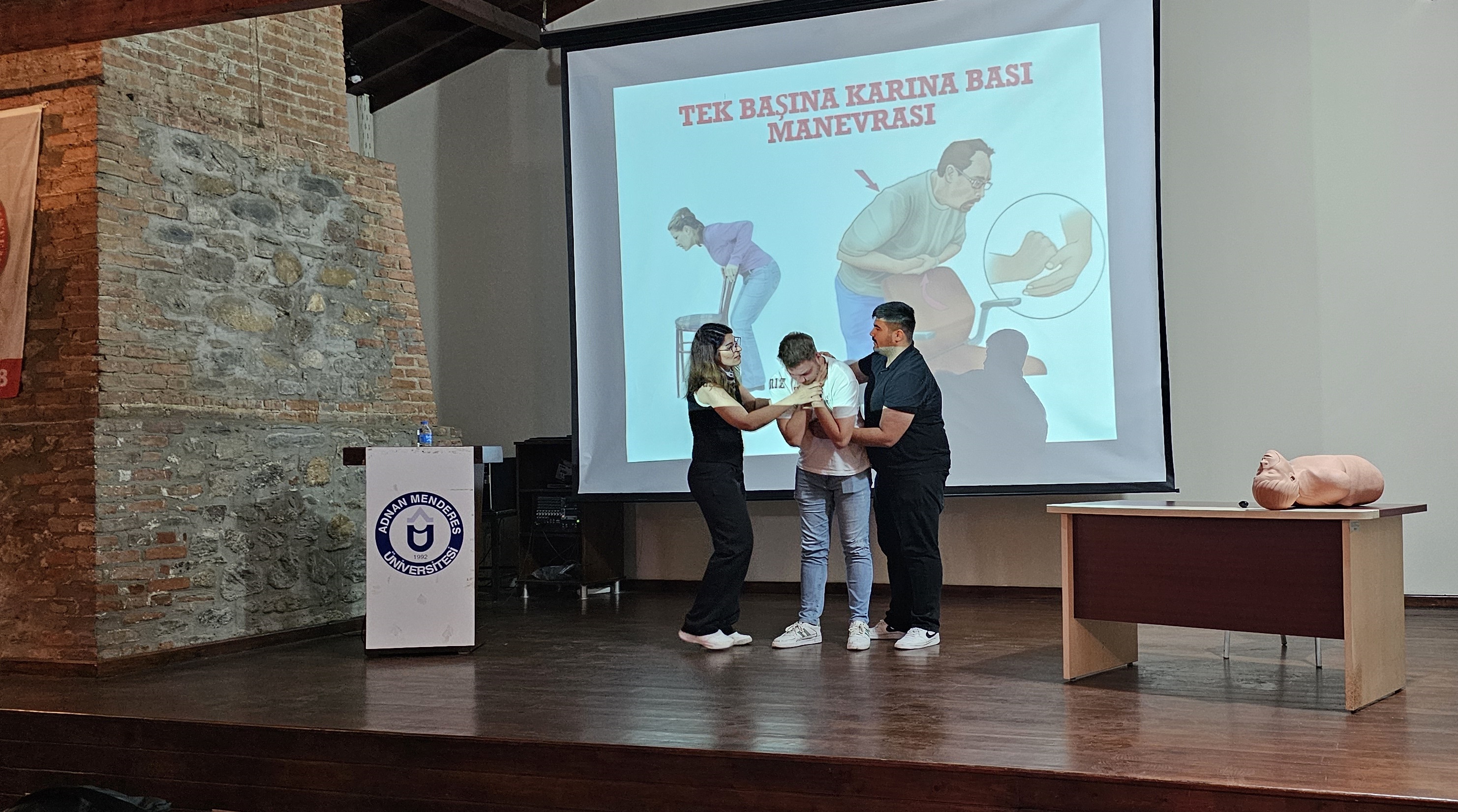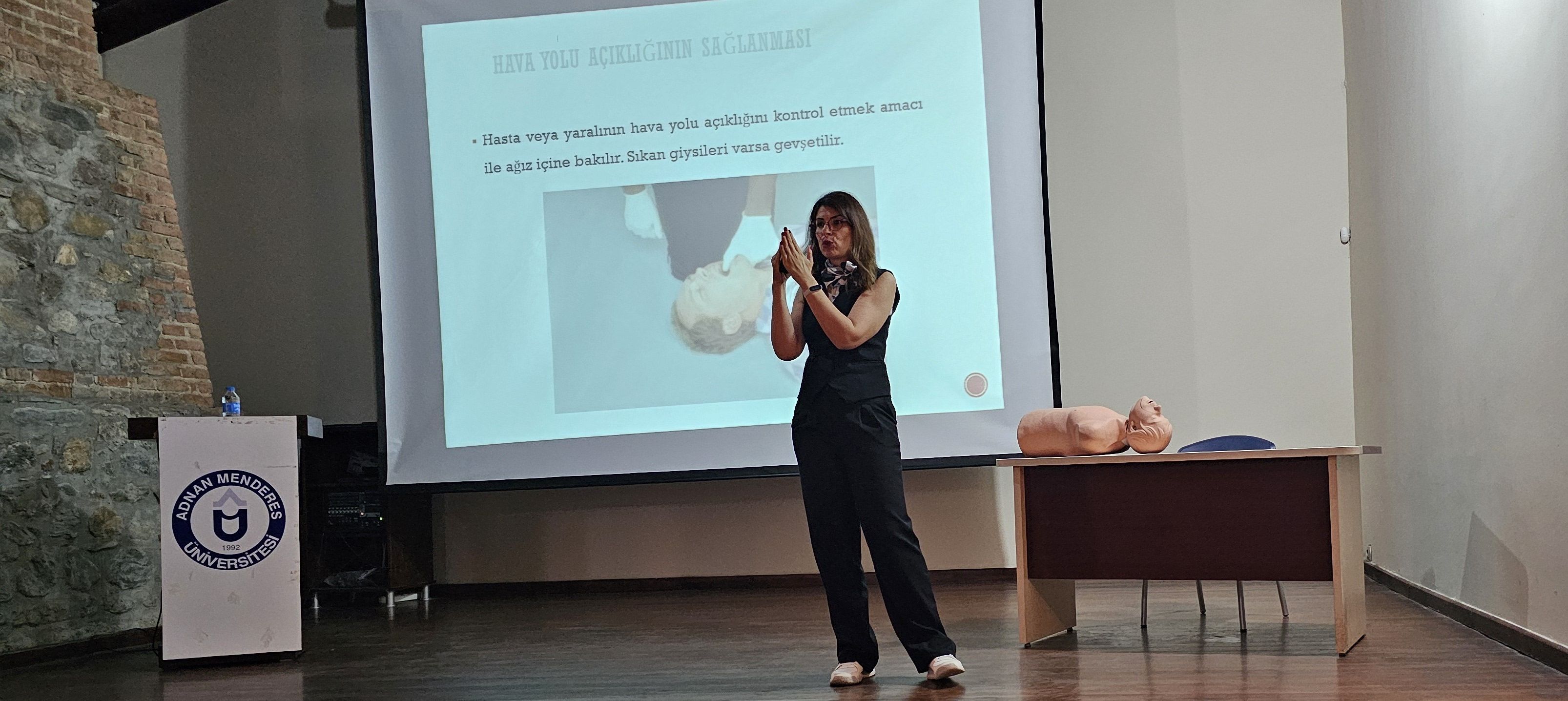 Üniversitemiz İlkyardım Eğitimi Merkezi Eğitmenlerinden Sayın Öğr. Gör. Öğr. Gör. Dr. Hilal Hatice ÜLKÜ tarafından Aydın Adnan Menderes Üniversitesi Sultanhisar Meslek Yüksekokulu akademik/idari personel ile öğrencilerine yönelik 17 Mayıs 2024 tarihinde, Cuma günü, saat 10.30'da Aydın Adnan Menderes Üniversitesi Sultanhisar Meslek Yüksekokulu Ahmet Hakkı Balcıoğlu Yerleşkesi Konferans Salonunda "TEMEL İLKYARDIM EĞİTİMİ" etkinliği gerçekleştirildi.
