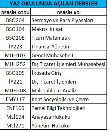 2020/2021 Eğitim-Öğretim yılı sonu Yaz Okulunda açılan dersler aşağıdaki tabloda belirtilmiştir. Yaz okulunda açılmayan derslere ders kaydı yapan öğrencilere ücret iadelerinin yapılabilmesi için öğrencilerin kendi adlarına açılmış banka hesaplarına ait IBAN numaralarının OBİS'e girilmiş olması gerekmekte olduğundan IBAN numaranızı OBİS üzerinden "Öğrenci İşlemleri > Öğrenci Bilgileri" ekranında "Diğer" sekmesinde "Banka Hesap Bilgileri" başlığı altından güncelleyebilirsiniz.