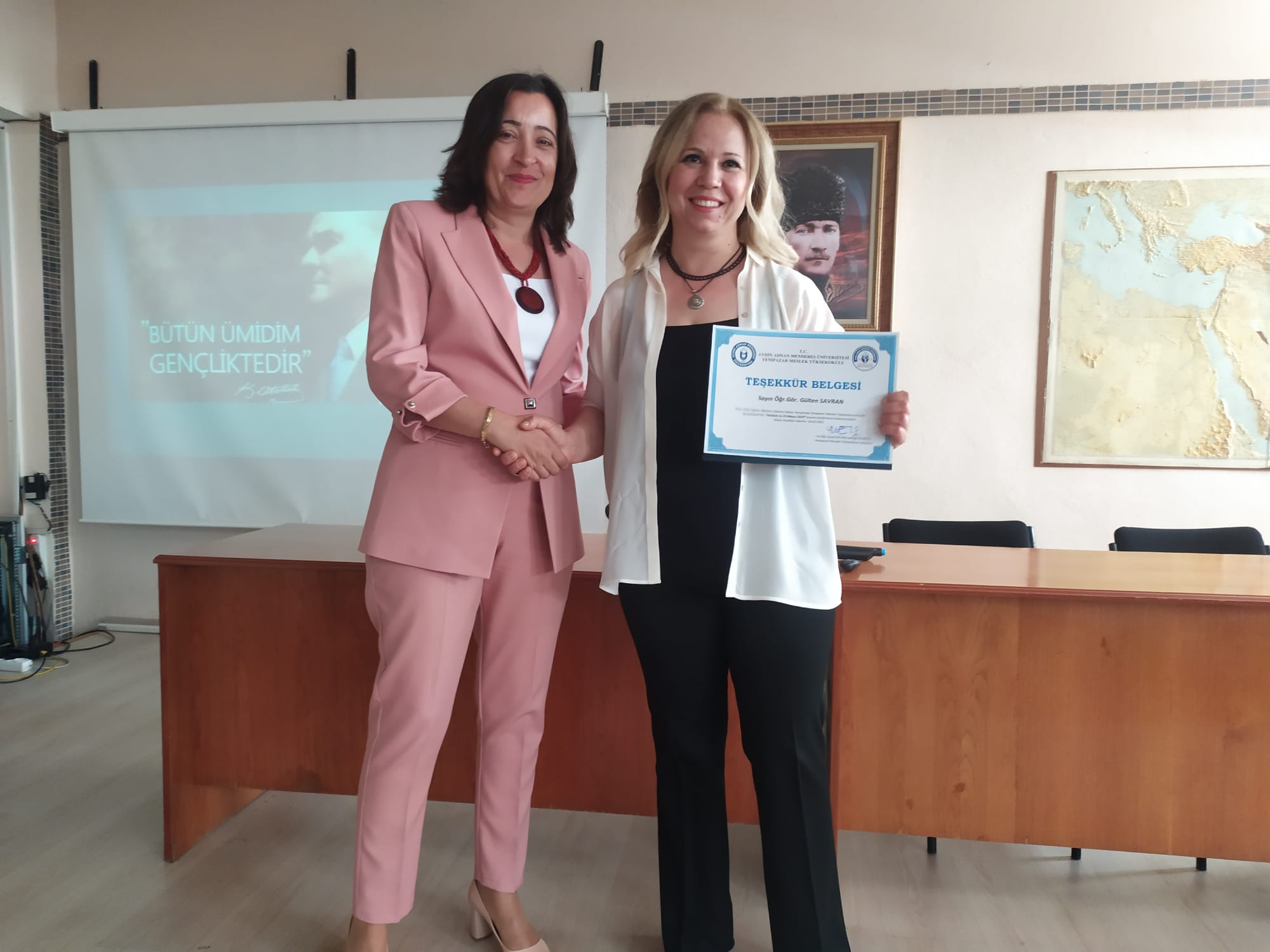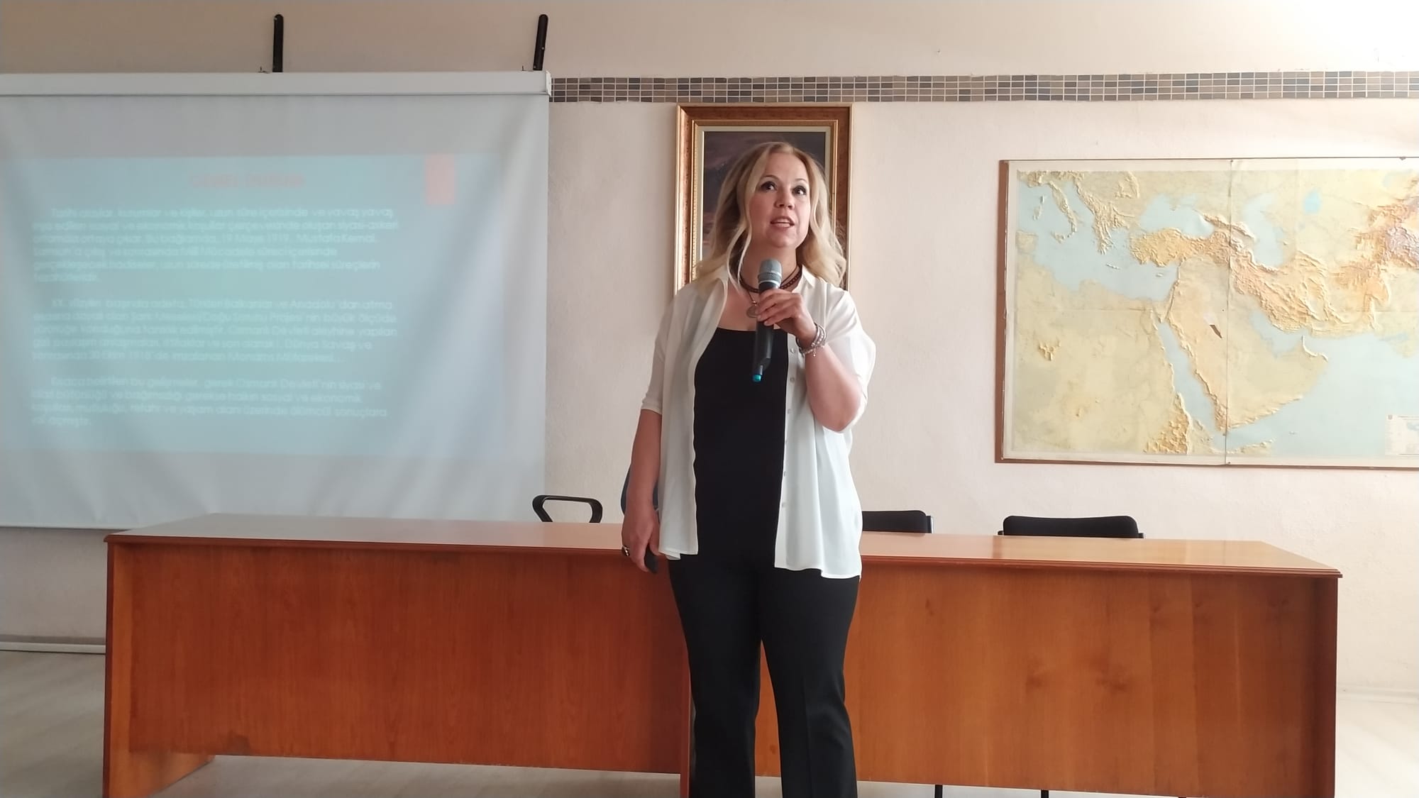 Sorularını yöneltip sonra da tek tak yanıtladı. Katılımcıların yoÄŸun ilgi gösterdiÄŸi konferans soru-yanıt bölümüyle sona erdi. Sunumun sonunda Okul müdürü Dr. Elif Meryem Yurdakul, Gülten Savran’a teÅŸekkür belgesi verdi.