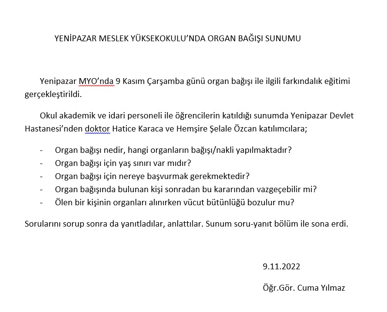YENİPAZAR MESLEK YÜKSEKOKULU’NDA ORGAN BAĞIŞI SUNUMU